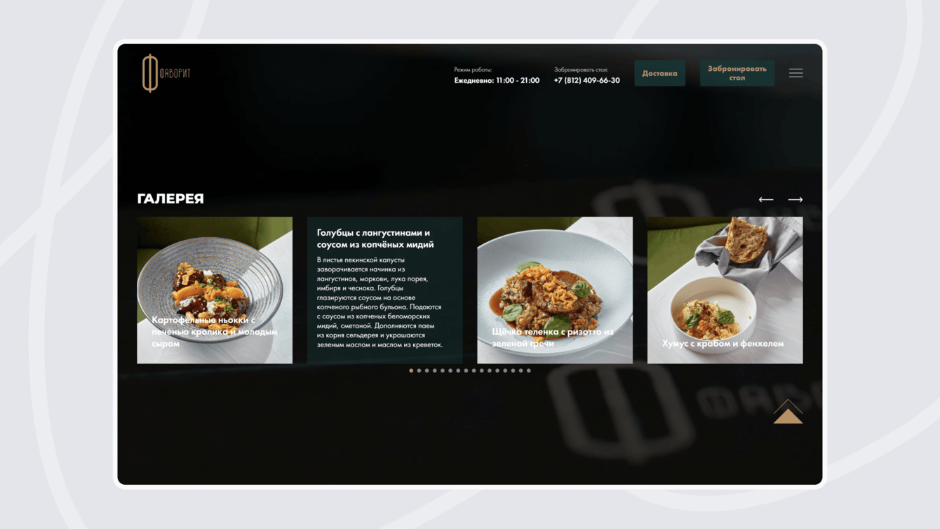 Разработать вовлекающий сайт ресторана «Фаворит», который будет прост в навигации и даст полное представление пользователю о бренде с первого касания.