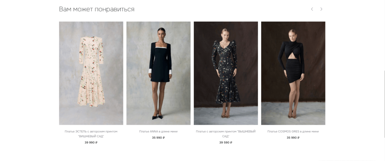 • Реализовали блок «Вам также может понравиться». Зачем: Это ключевой инструмент для повышения среднего чека и клиентской вовлеченности. Система анализирует выбранные товары и предлагает идеальные дополнения (аксессуары, вещи из той же коллекции или схожей стилистики), превращая единичную покупку в целостный образ.