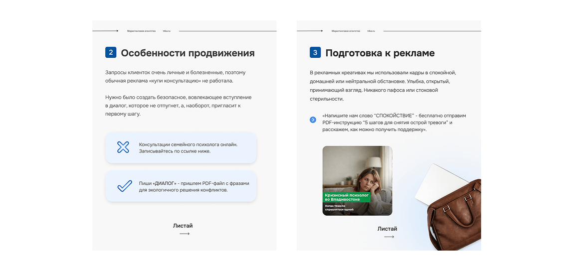 «Напишите нам слово “СПОКОЙСТВИЕ” - бесплатно отправим PDF-инструкцию “5 шагов для снятия острой тревоги” и расскажем, как можно получить поддержку». Это снижало барьер: человек получает ценность сразу, а не просто вступает в продающий диалог.