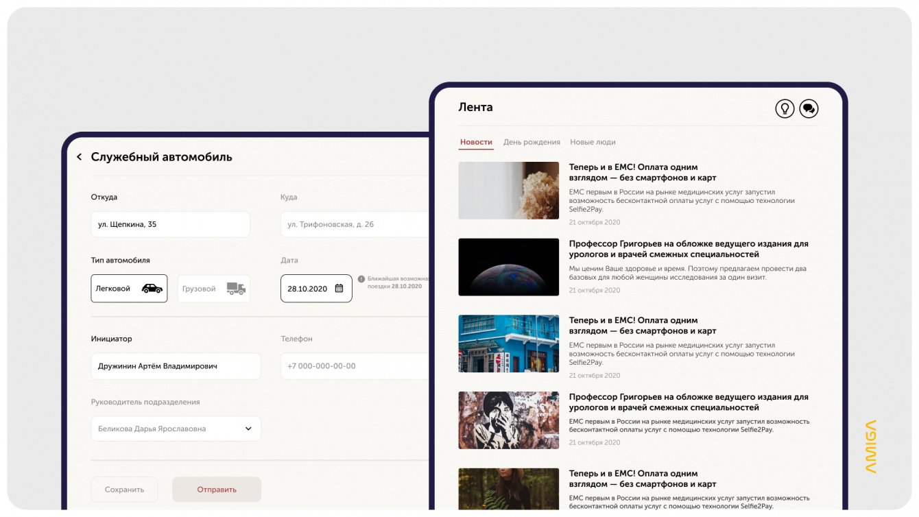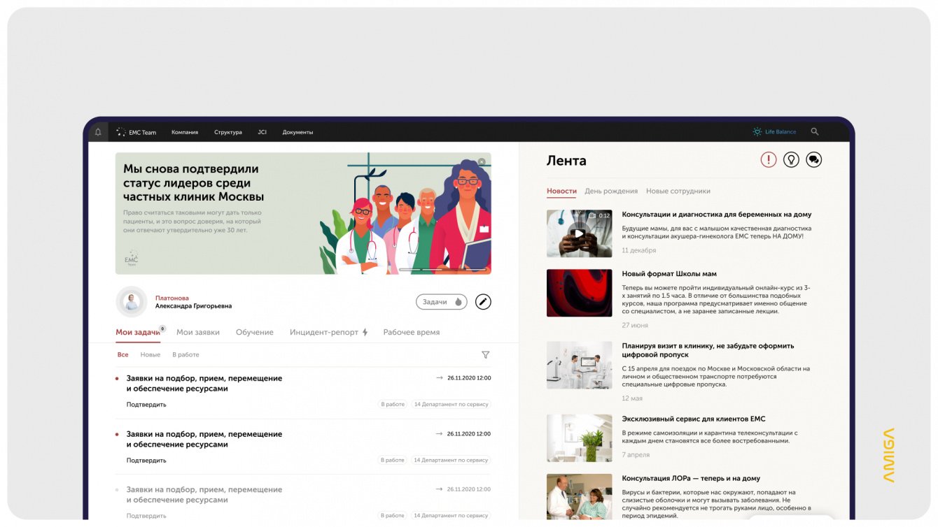 К нам с запросом на технические доработки пришли EMC Team. У медицинского центра уже был корпоративный портал — это единая точка входа для всех систем. Он интегрирован со всеми необходимыми платформами. При любом запросе сотрудник в первую очередь зайдет на корпоративный сайт.