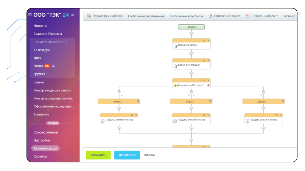 3. Настроить автоматизацию и роботов для регистрации заявки, передачи ее в работу сотрудникам для отработки, автоматической постановки задач