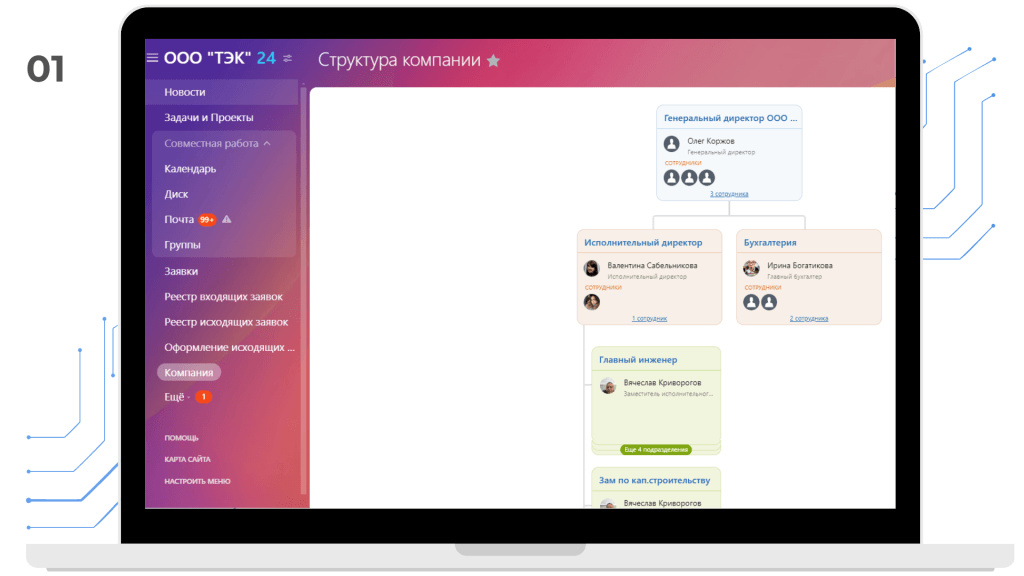 В первую очередь настроили структуру компании и добавили сотрудников, так же мы предоставили обучение для знакомства с сервисом