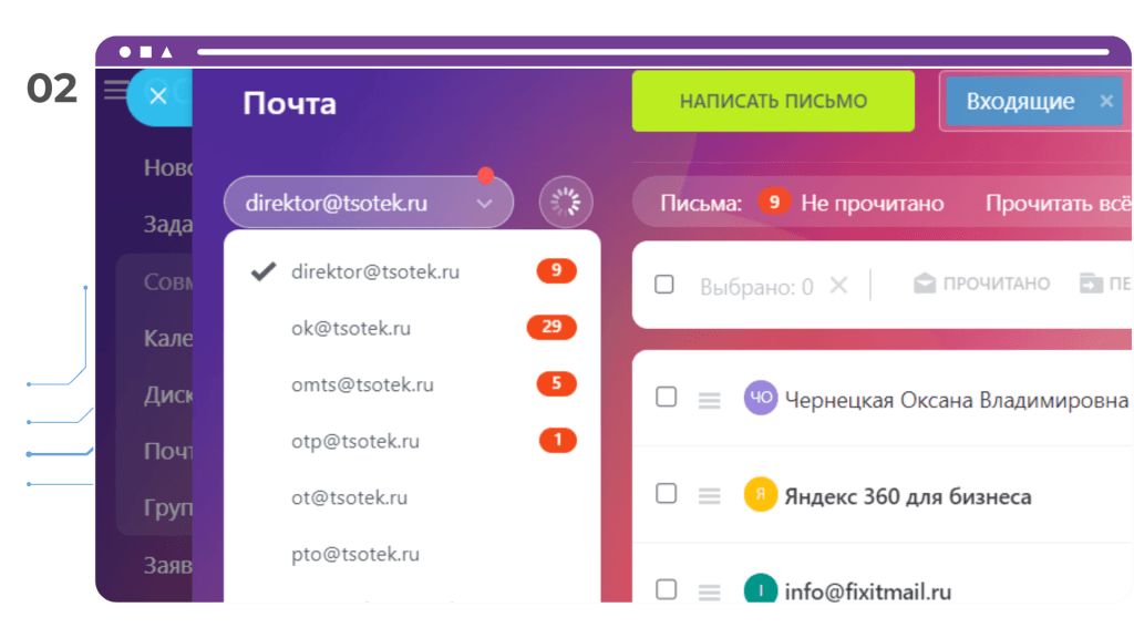 Подключили почту как у отдельных сотрудников, так и общий ящик, для приема обращений клиентов.