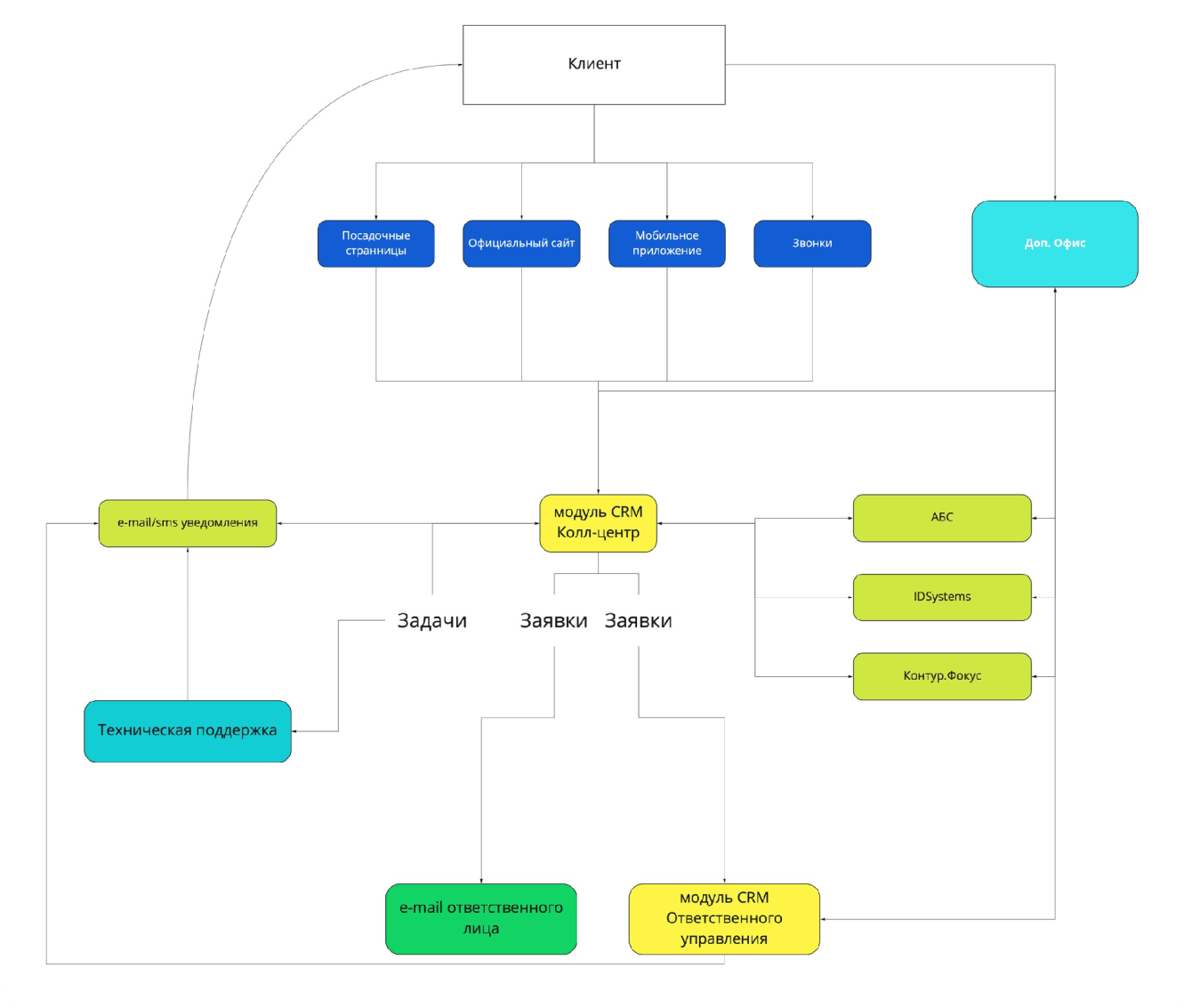 Онлайн-заявки на банковские продукты и обращения поступают с сайта банка, мобильного приложения, посадочных страниц и по телефону в модуль CRM Колл-центр.