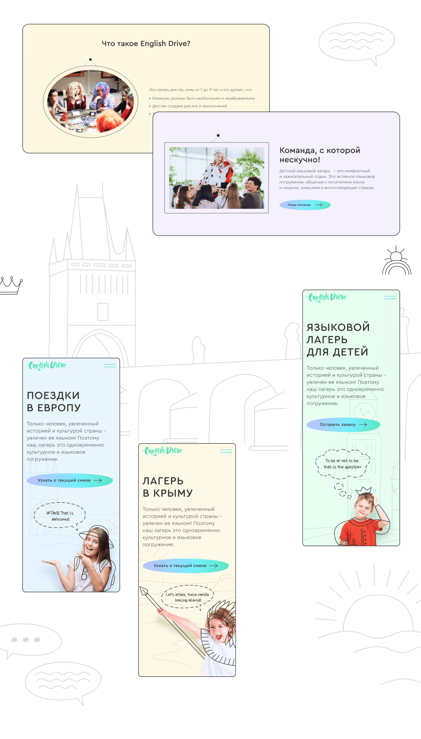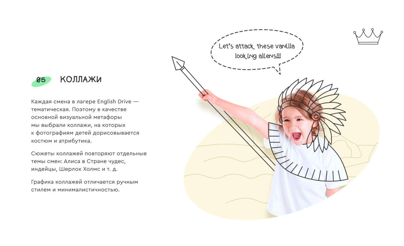 Каждая смена в лагере English Drive — тематическая. Поэтому в качестве основной визуальной метафоры мы выбрали коллажи, на которых к фотографиям детей дорисовывается костюм и атрибутика. Сюжеты коллажей повторяют отдельные темы смен: Алиса в Стране чудес, индейцы, Шерлок Холмс и т. д. Графика коллажей отличается ручным стилем и минималистичностью.