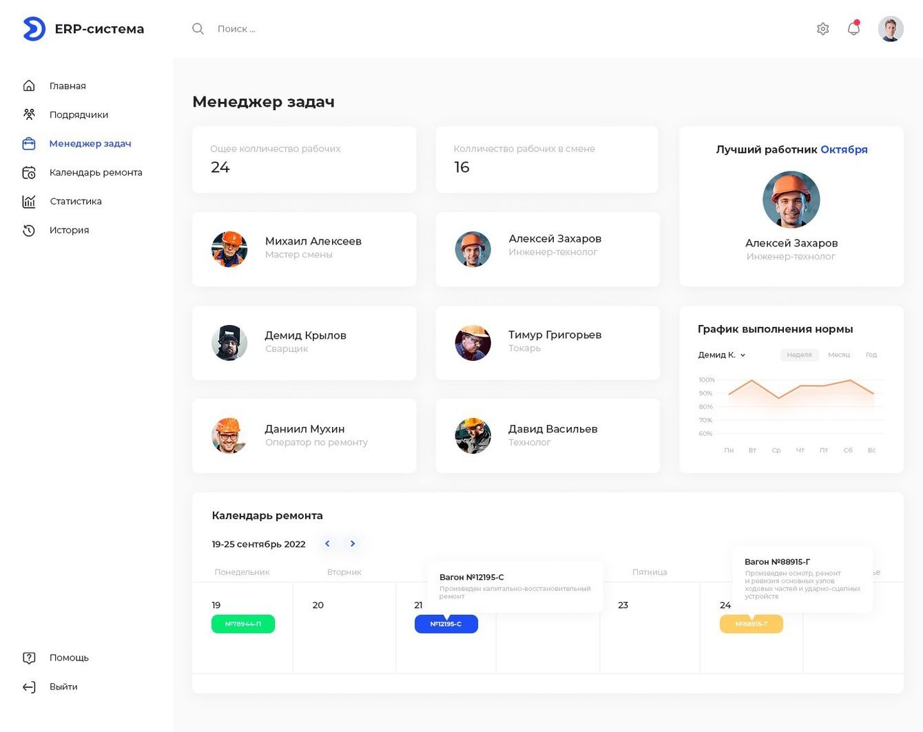 Была разработана и успешно внедрена ERP-систему, помогающая учитывать износ и простой ремонта, содержащая всю информацию по ремонту в единой базе данных и позволяющая наглядно видеть актуальный статус по текущим задачам.