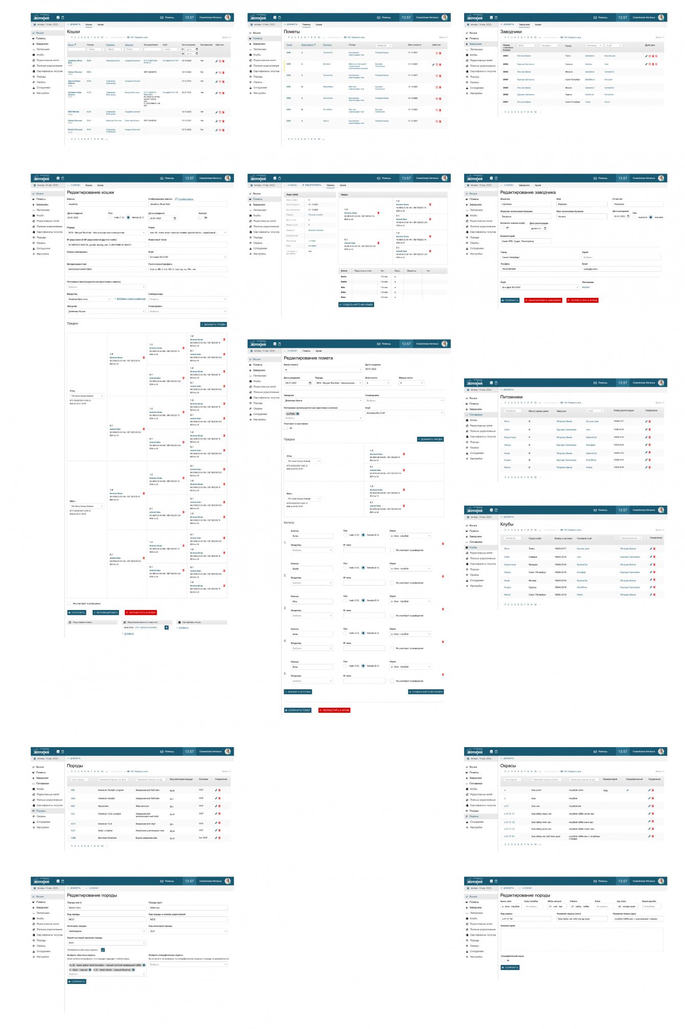 Система разработана на базе Rapido.CRM. При кажущейся на первый взгляд простоте, тема оказалась достаточно сложной. Казалось бы - ну что сложного тут может быть! Это же кошки. На деле выяснилось, что у кошек все не менее сложно, чем у людей, поэтому погружение в тему было всеобъемлющее для всех наших разработчиков. Нужно было разобраться во всех процессах клуба до мелочей, узнать много новых терминов, выяснить, какие документы и при каких условиях оформляют клубы регистрирующие результаты породного разведения животных.После составления списков параметров баз данных были отрисованы подробные прототипы страниц.