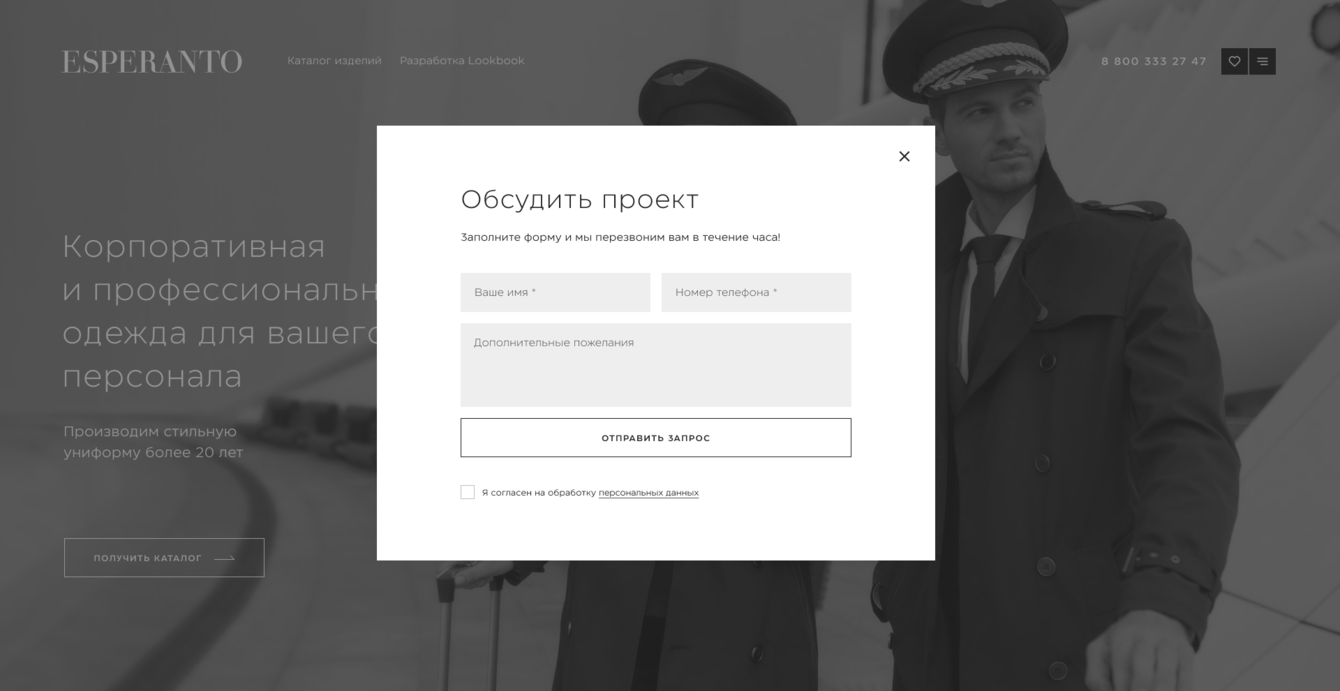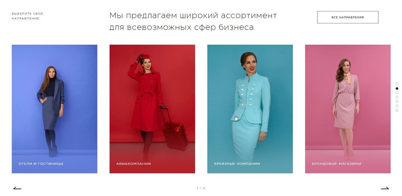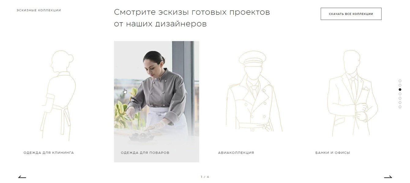 Остальные страницы сайта рассчитаны на конверсию. Важная составляющая — каталог с фильтром подбора униформы. Параметры фильтра: сфера бизнеса, пол, должность, тип изделия, стиль.