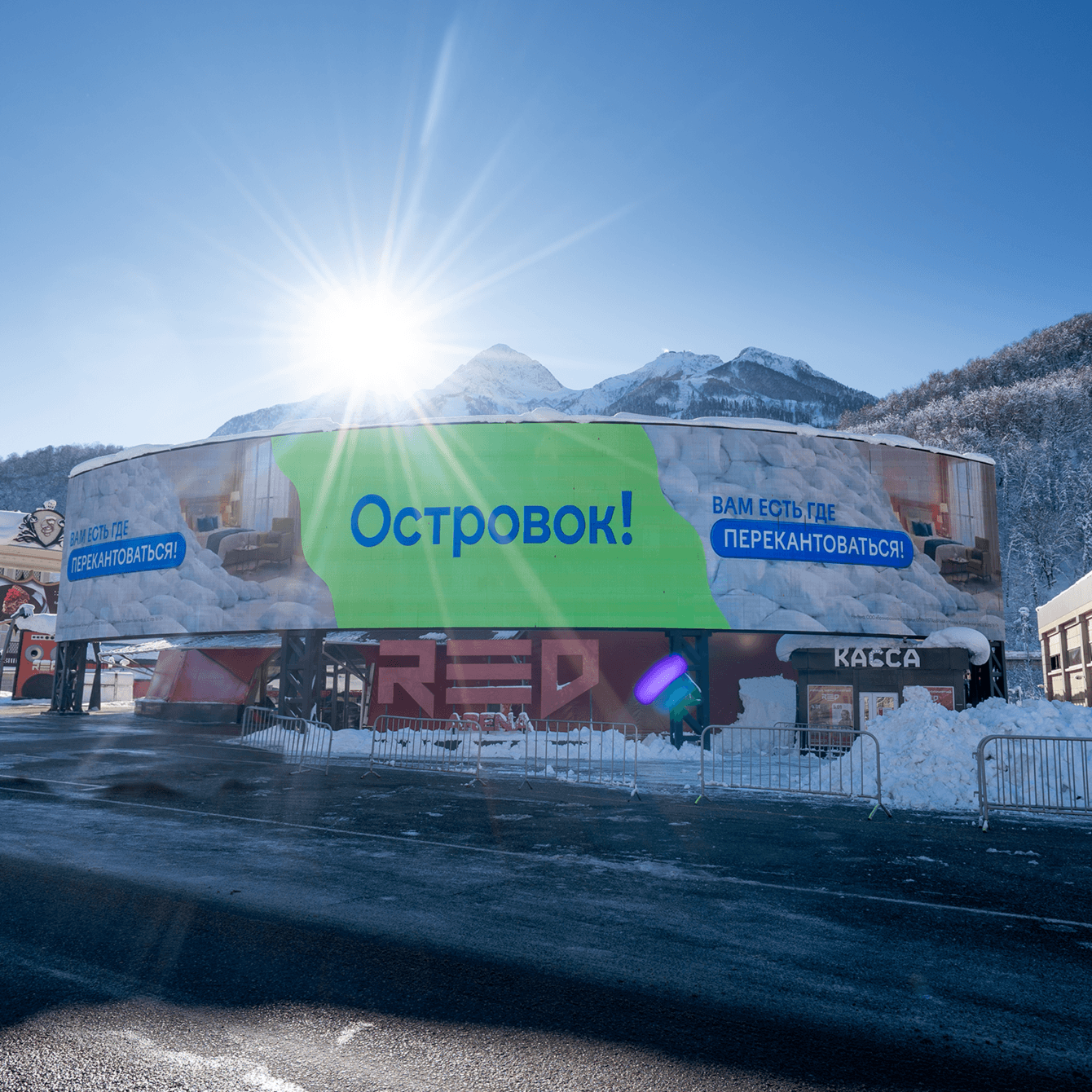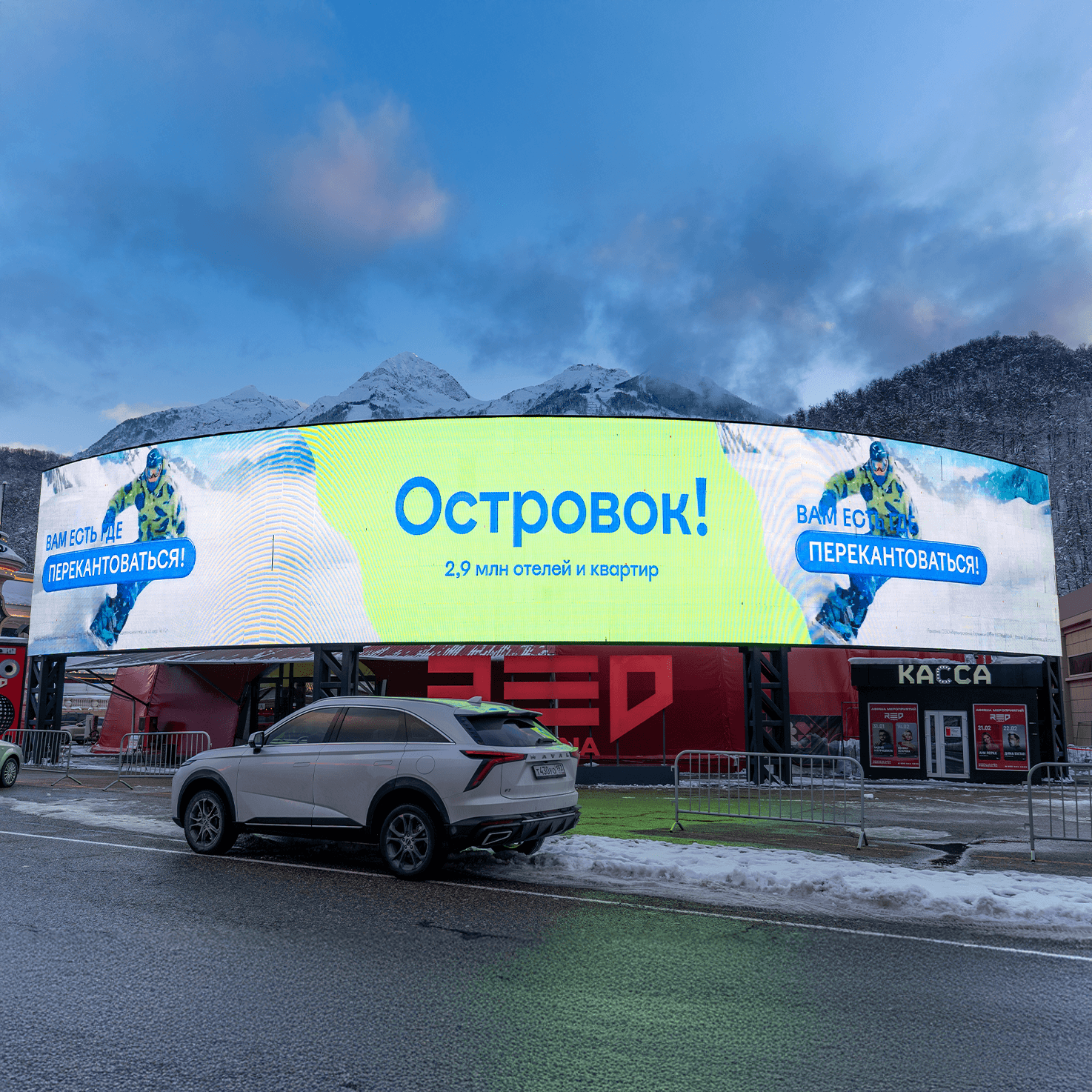 Сервис бронирования отелей и квартир «Островок!» запустил кампанию для продвижения горнолыжных направлений в зимний сезон. Мы разработали креативную идею и видеоролик для наружной рекламы. Кампания размещалась на медиафасадах в Красной Поляне и в аэропортах Новокузнецка, Новосибирска, Сочи и Минеральных Вод — там, где концентрируются любители горных лыж и сноубордов.