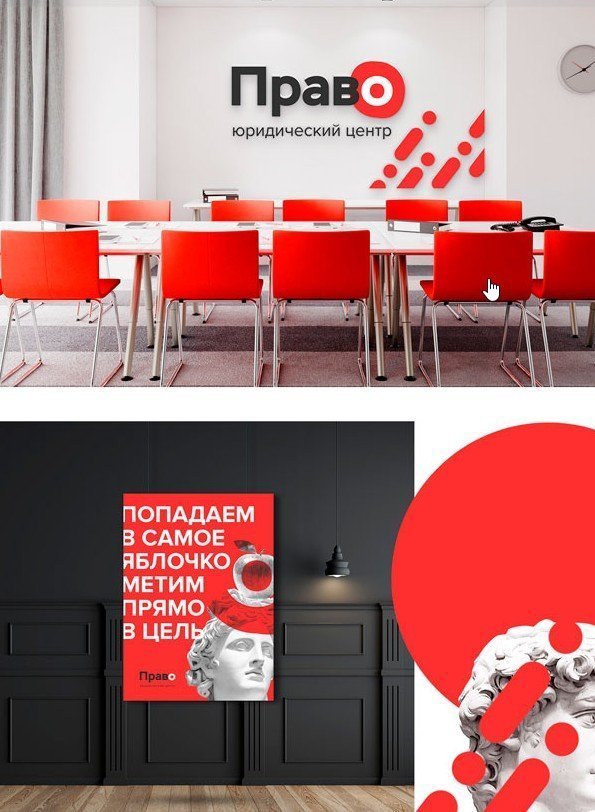 Скажем честно, не та, в которую мы влюбились. «Право» с красной мишенью, современные паттерны и скульптура Давида на рекламном постере действительно попали в яблочко. В эту же концепцию влюбилась и наша заказчица. Но, после долгих переговоров и совместных раздумий, мы решили остановиться на более строгом варианте ― букве П, указывающей правильный путь.