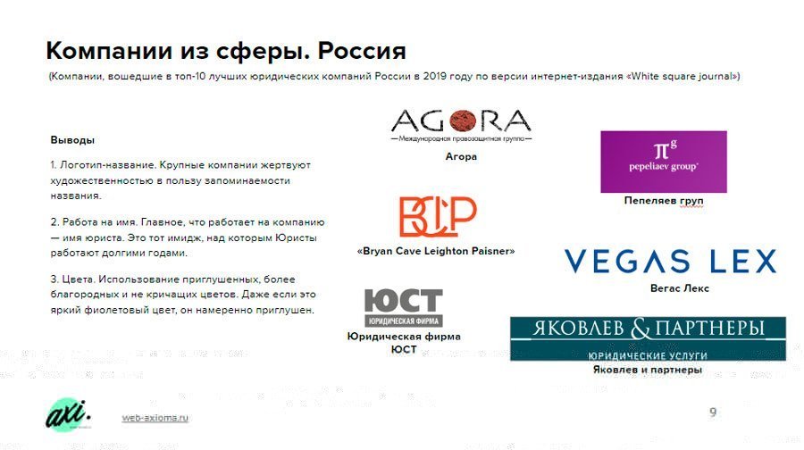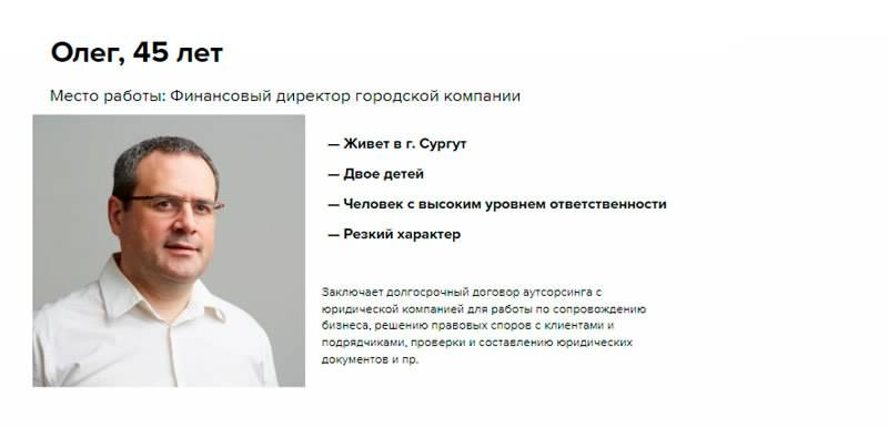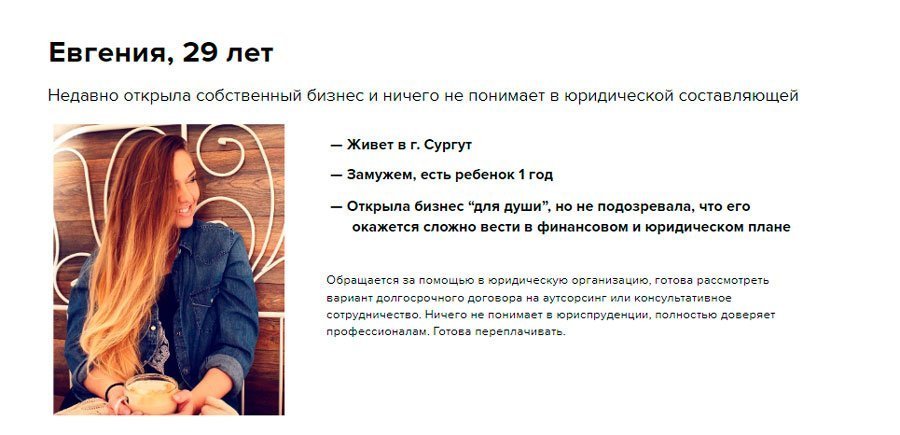 Однако главным ядром ЦА все же являются бизнесвуман 30-45 лет, не разбирающиеся в юридических вопросах и области ведения договорной работы. Им проще довериться специалисту на аутсорсе и заниматься более приятными для них вещами.