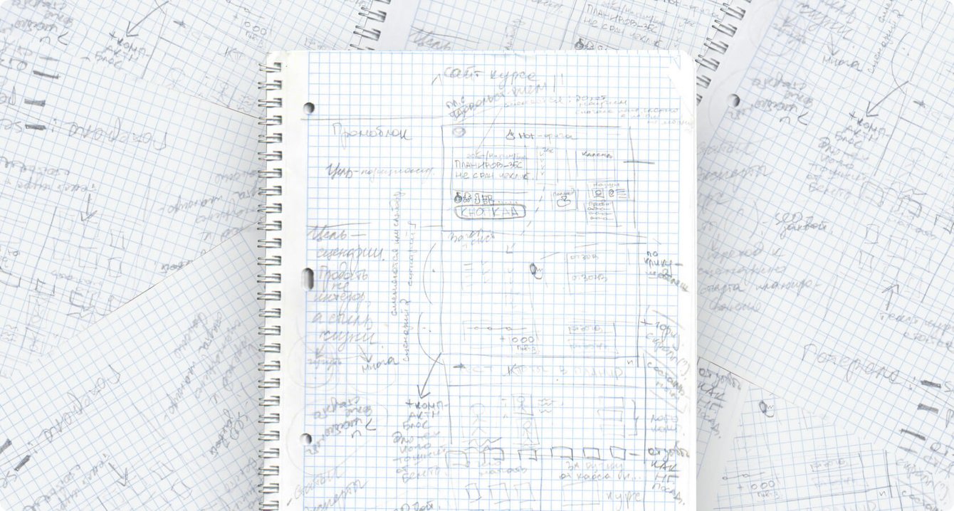 Работу над прототипами мы начали со скетча. Он помог быстро определить структуру страниц, понять, каких блоков не хватает, и зафиксировать элементы старого сайта, с которыми мы не готовы расставаться. Уже на этом этапе появились новые идеи — например, блок с тестом из нашего курса по тайм-менеджменту, который раньше существовал только в телеграм-боте.