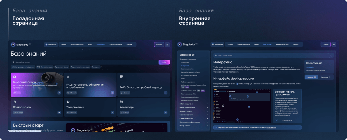 Наша задача была не просто перечислить возможности, а выделить ключевые и дать пользователю понятную точку входа в детали. Для этого каждый блок с фичей связан с соответствующим разделом базы знаний — к подробной инструкции можно перейти в один клик.