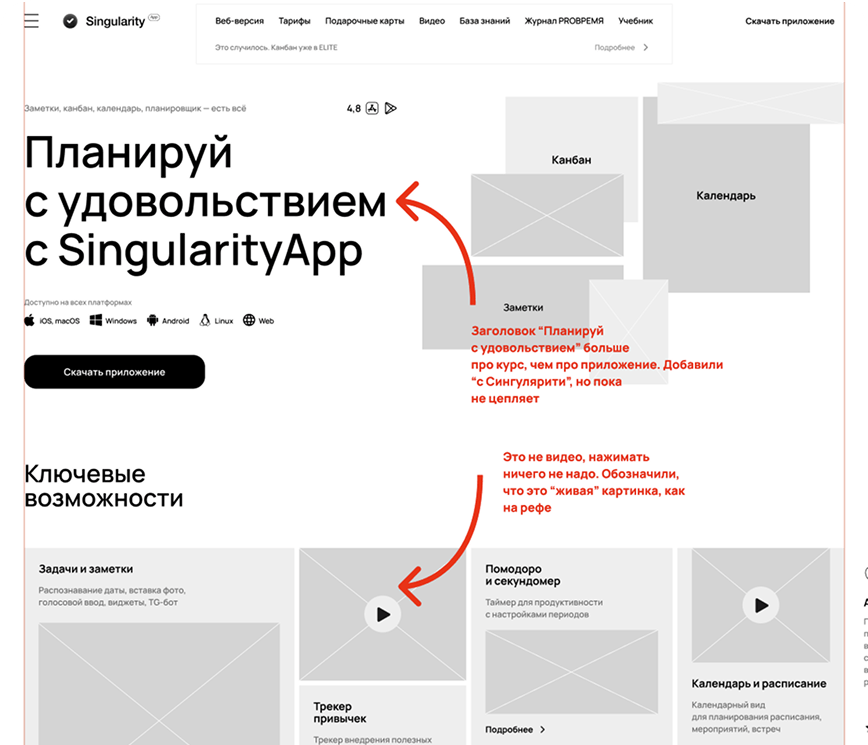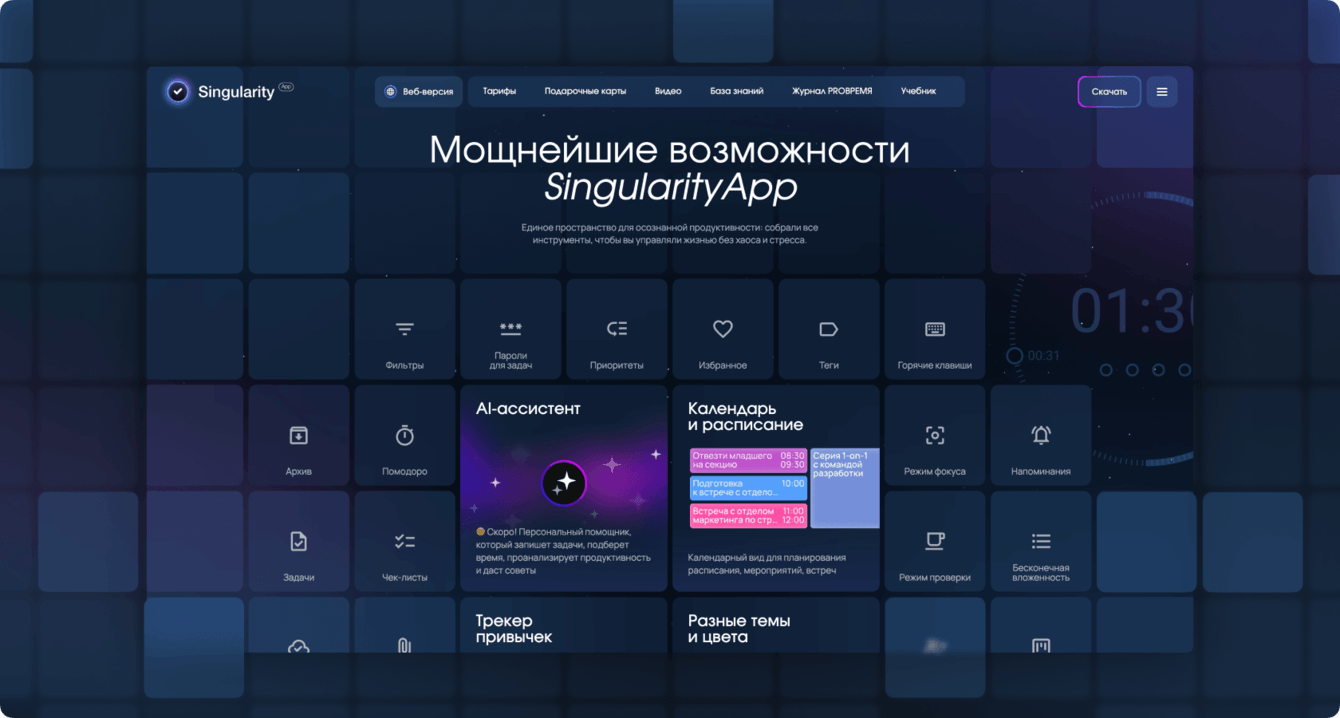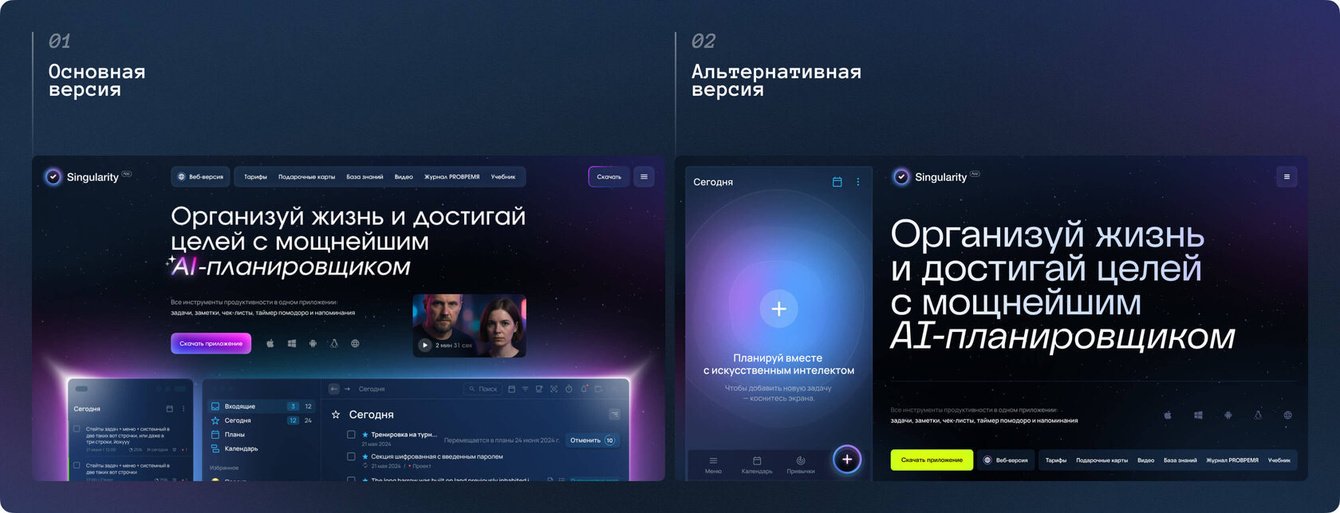 SingularityApp развивается с 2018 года, и за это время сайт прошёл большой путь — от яркого промо с 3D-графикой до сложного продуктового инструмента. Приложение заметно выросло по функциональности, вышло за рамки личного планировщика, получило командные сценарии и AI-возможности. К началу 2025 года стало понятно: текущий сайт больше не отражает масштаб продукта и требует переосмысления.