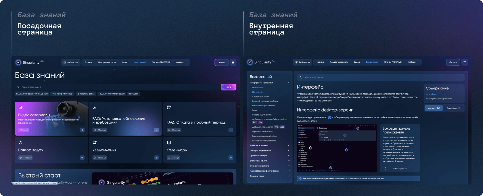 Наша задача была не просто перечислить возможности, а выделить ключевые и дать пользователю понятную точку входа в детали. Для этого каждый блок с фичей связан с соответствующим разделом базы знаний — к подробной инструкции можно перейти в один клик.