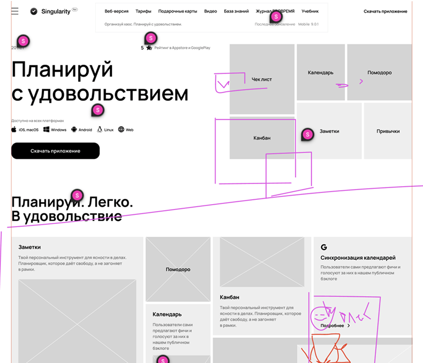 SingularityApp развивается с 2018 года, и за это время сайт прошёл большой путь — от яркого промо с 3D-графикой до сложного продуктового инструмента. Приложение заметно выросло по функциональности, вышло за рамки личного планировщика, получило командные сценарии и AI-возможности. К началу 2025 года стало понятно: текущий сайт больше не отражает масштаб продукта и требует переосмысления.