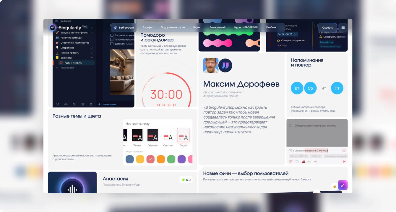 Дополнительно на главной странице мы собрали лучшие статьи из журнала PRO Время о планировании и личной эффективности и дополнили их отзывами пользователей из сторов. Это помогло показать продукт не только через интерфейс, но и через реальный опыт людей.