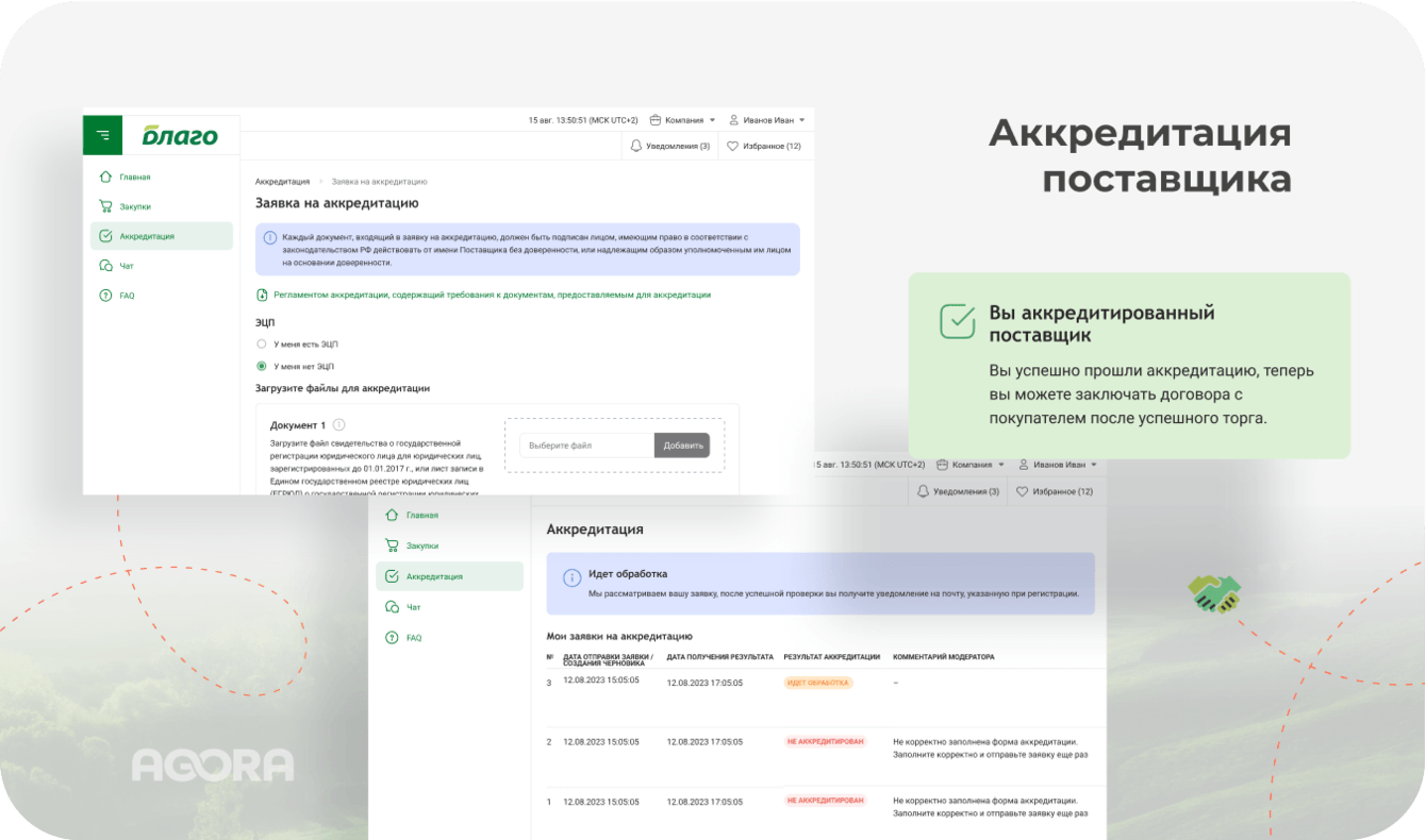• Аккредитация поставщиков: реализовать функционал аккредитации поставщиков на платформе, позволяющий быстро проверять и утверждать данные.