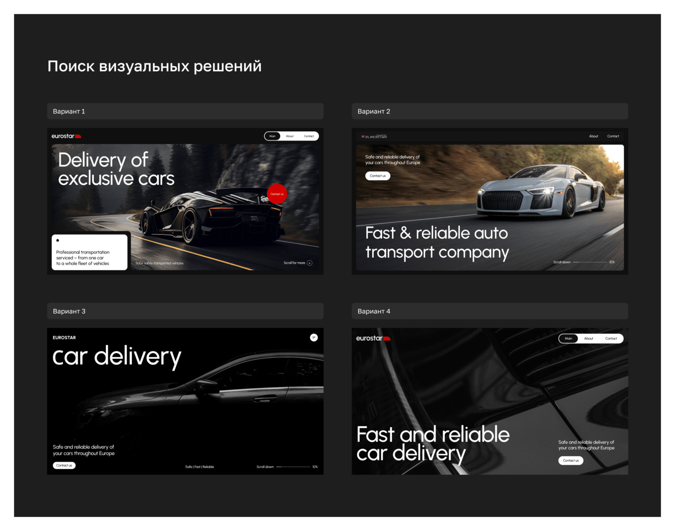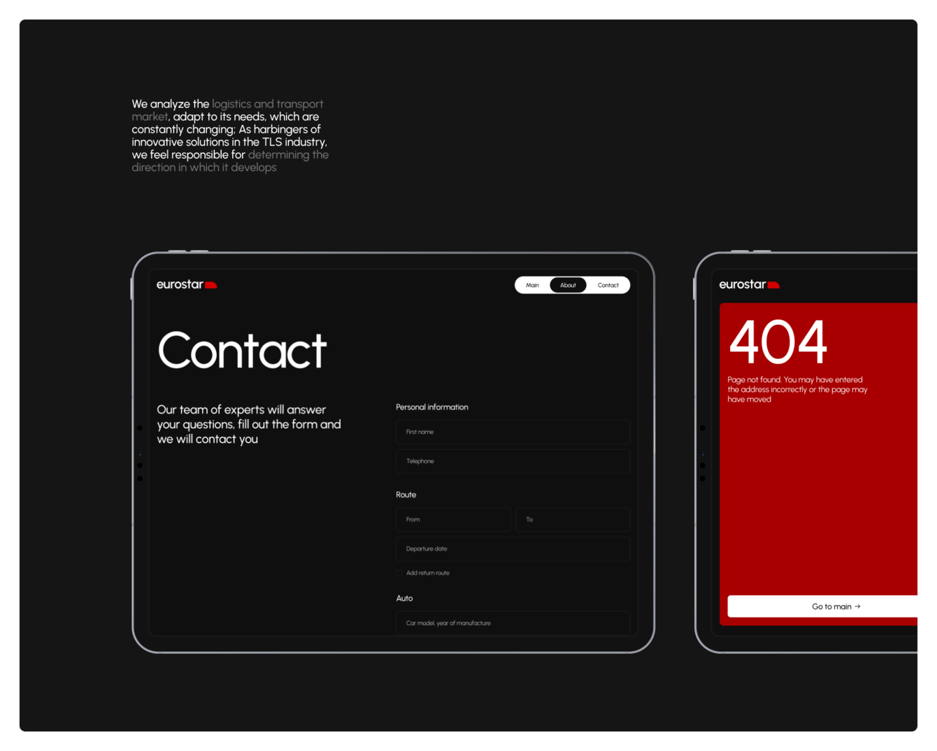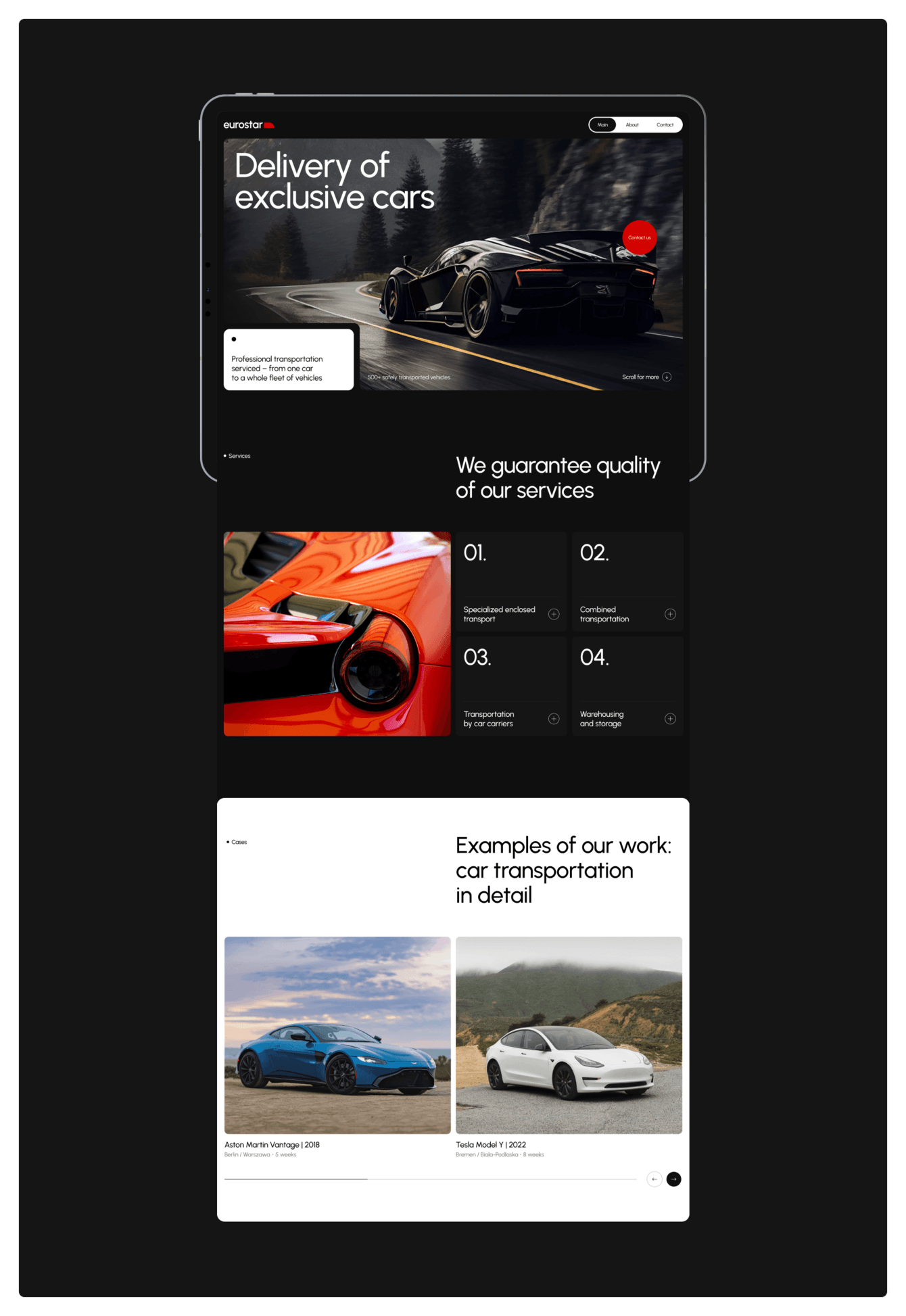 Для решения поставленных задач мы начали с детального бизнес-анализа, чтобы глубоко понять требования и цели компании EuroStar. На основе этого анализа разработали концепцию сайта, как смелое сочетание современного стиля и брутальности, которое подчеркивает премиальный уровень услуг и эксклюзивные перевозки. Мы интегрировали интерактивные элементы, такие как динамичные анимации и интерактивные карты, чтобы подчеркнуть сотрудничество с высококлассными клиентами и уникальные особенности бизнеса. Мы использовали стилистику, которая не просто выделяется на фоне конкурентов, а задает новый стандарт для визуального и функционального восприятия