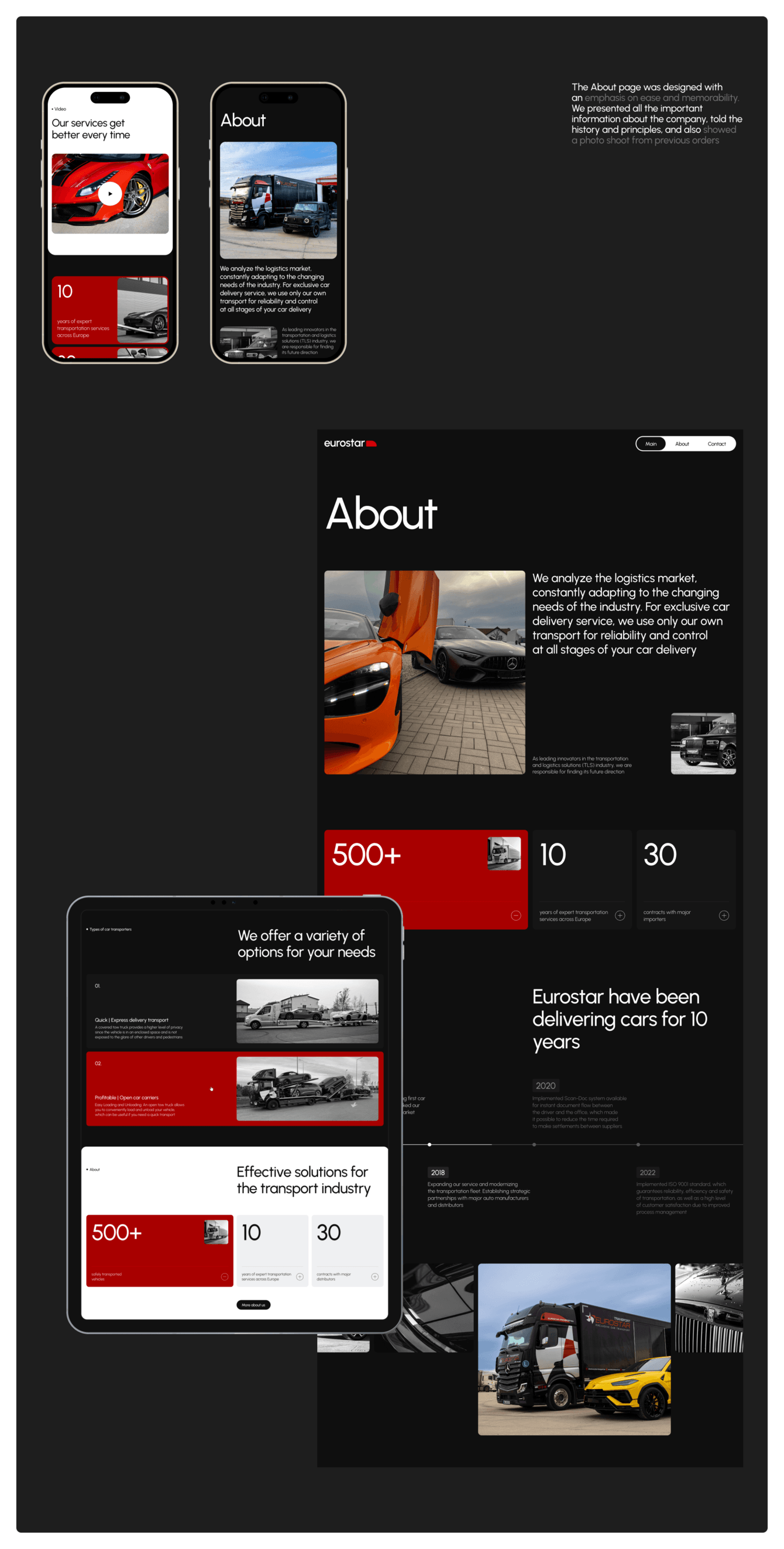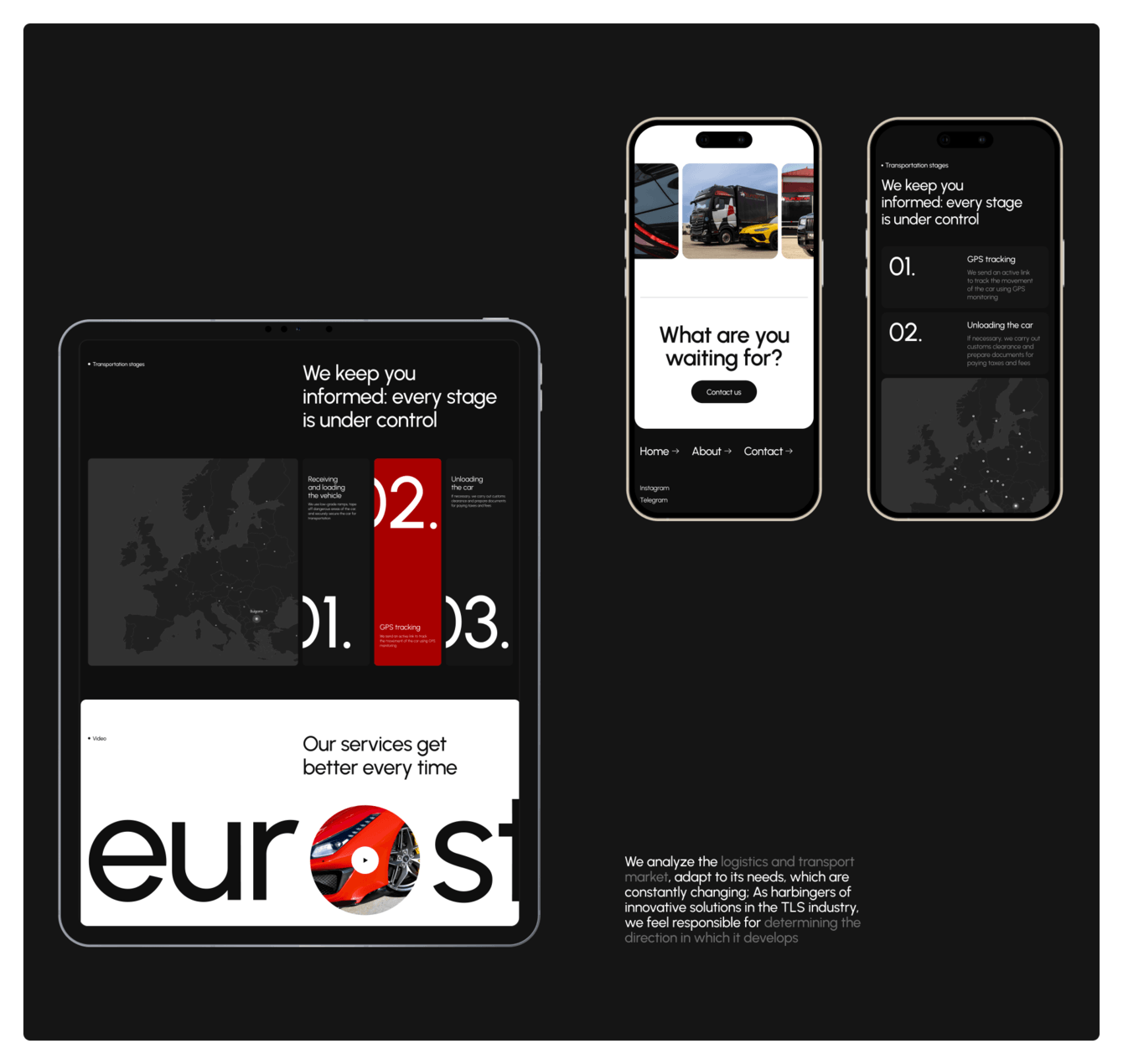 Для решения поставленных задач мы начали с детального бизнес-анализа, чтобы глубоко понять требования и цели компании EuroStar. На основе этого анализа разработали концепцию сайта, как смелое сочетание современного стиля и брутальности, которое подчеркивает премиальный уровень услуг и эксклюзивные перевозки. Мы интегрировали интерактивные элементы, такие как динамичные анимации и интерактивные карты, чтобы подчеркнуть сотрудничество с высококлассными клиентами и уникальные особенности бизнеса. Мы использовали стилистику, которая не просто выделяется на фоне конкурентов, а задает новый стандарт для визуального и функционального восприятия