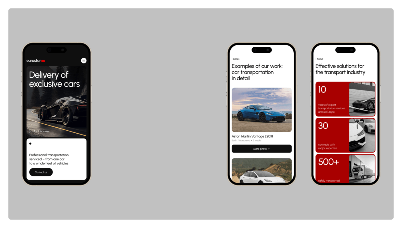 Сайт для EuroStar — это коктейль современного стиля и брутальности, идеально подчеркивающий премиальный уровень услуг и эксклюзивные перевозки. Его дизайн сразу бросается в глаза на фоне конкурентов. Эффектные анимации и продуманные интерактивные элементы обеспечивают высокий уровень вовлеченности пользователей и укрепляют имидж компании в B2B и B2C сегментах. Это не просто сайт, а яркое и функциональное выражение бренда, которое говорит само за себя.