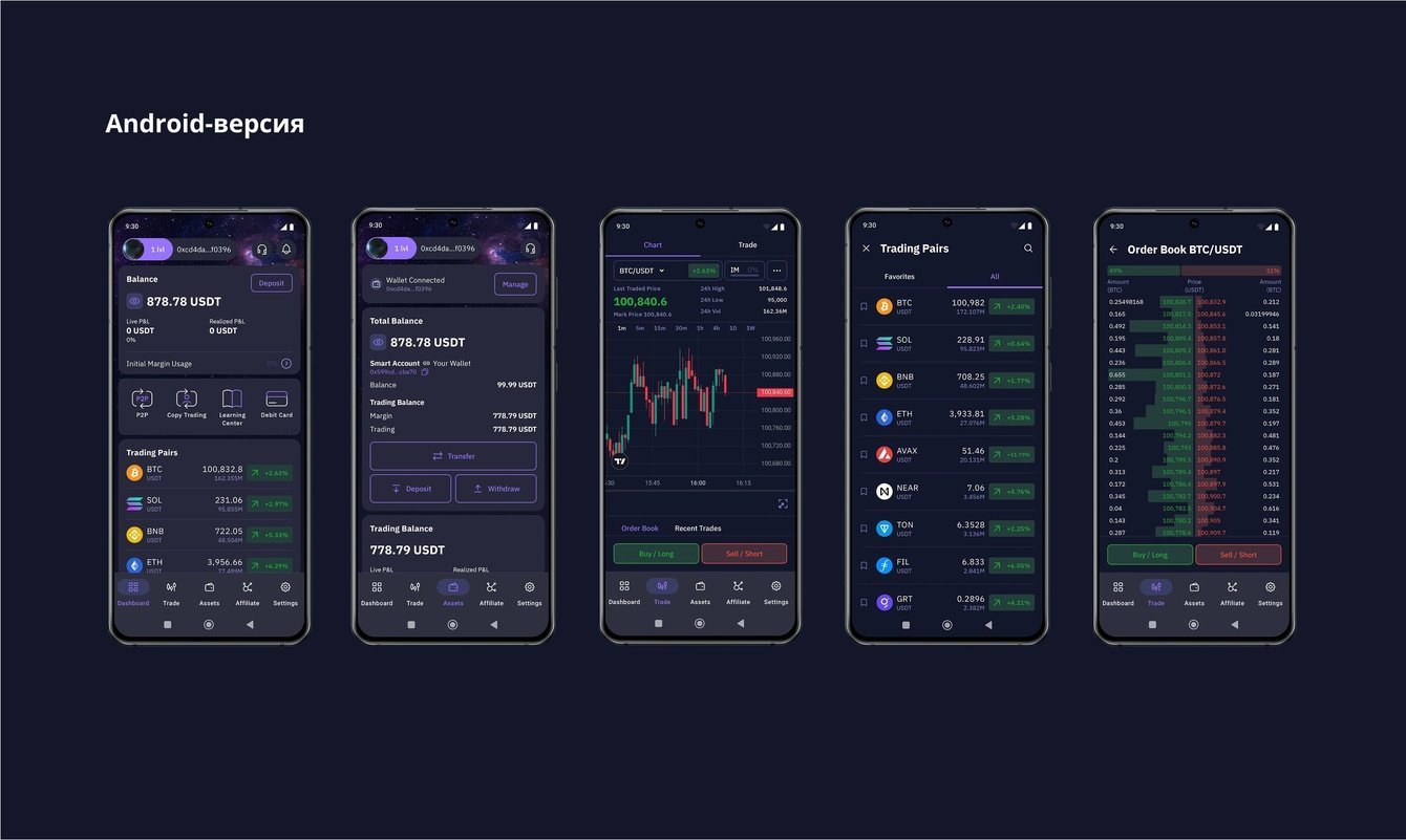 Мы изучили опыт популярных бирж — Bybit, OKX, Kraken и Binance — и взяли всё лучшее в плане UX. Наш интерфейс получился максимально знакомым и интуитивно понятным для тех, кто уже работал с криптобиржами.