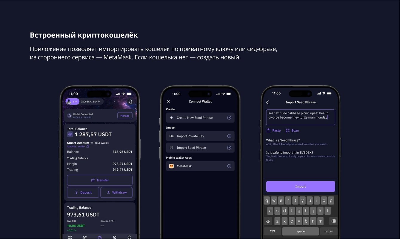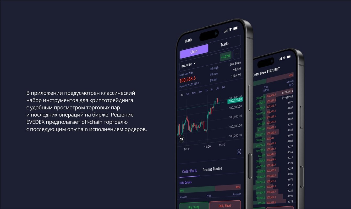 Мы разработали современное и удобное мобильное приложение, которое стало важной частью экосистемы EVEDEX. С ним можно быстро подключить кошелёк, торговать прямо со смартфона и быть уверенным в безопасности своих средств.