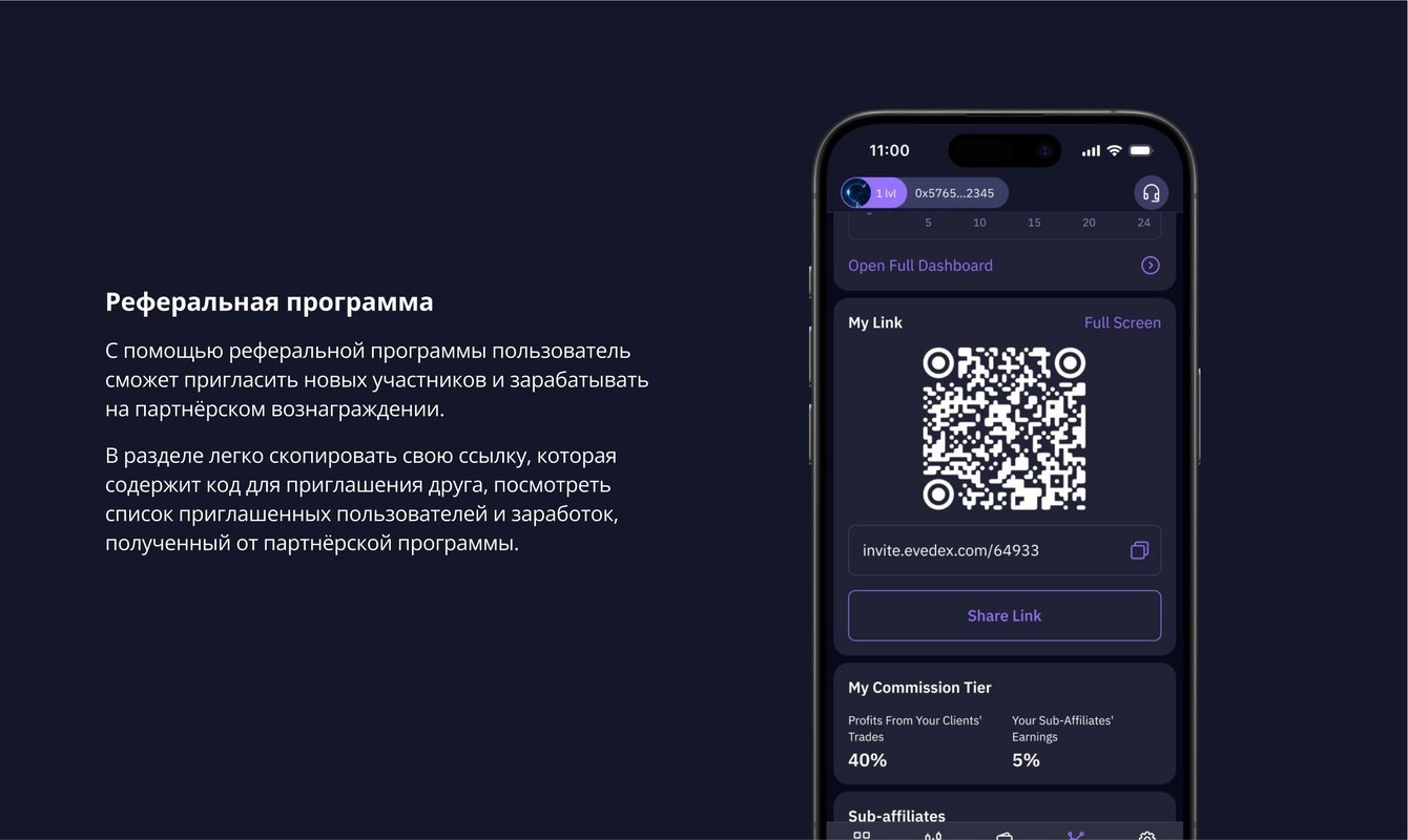 В EVEDEX мы реализовали возможность приглашать новых трейдеров в экосистему, делиться реферальными ссылками и отслеживать заработок c каждого приведённого пользователя. При этом на самой платформе информация о партнёрах по умолчанию остается анонимной — видны только их кошельки. Для децентрализованных бирж функция реферальной программы довольно редкая.