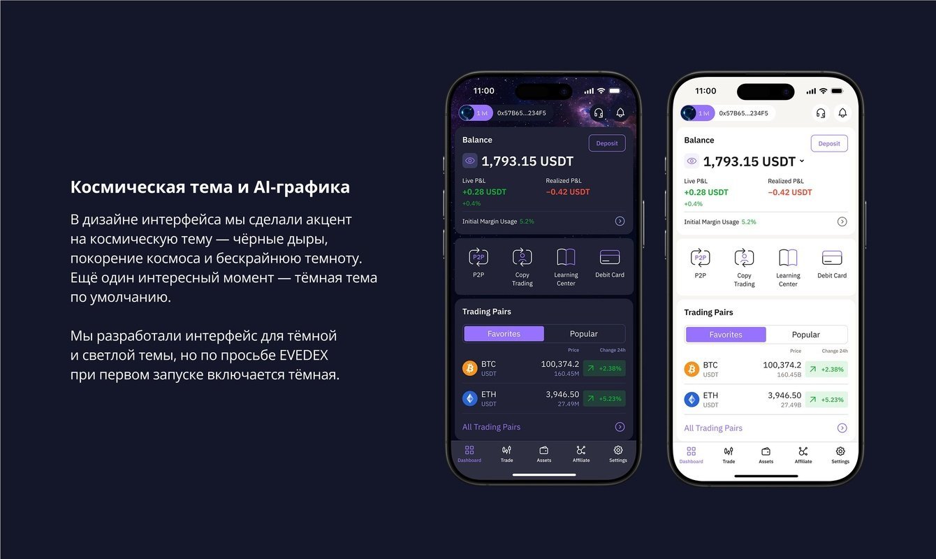 В дизайне интерфейса мы сделали акцент на космическую тему — чёрные дыры, покорение космоса и бескрайнюю темноту. Все это — часть концепции EVEDEX.