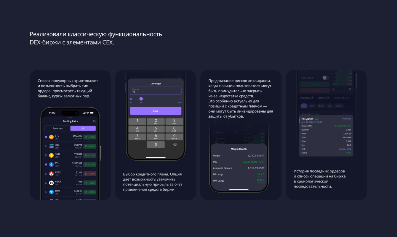 Приложение уже поддерживает все основные функции для торговли: рыночные и лимитные ордера, кросс-маржу. Но это только начало — архитектура приложения позволяет легко масштабироваться. В будущем мы сможем быстро добавлять новые функции и адаптироваться к изменениям рынка.