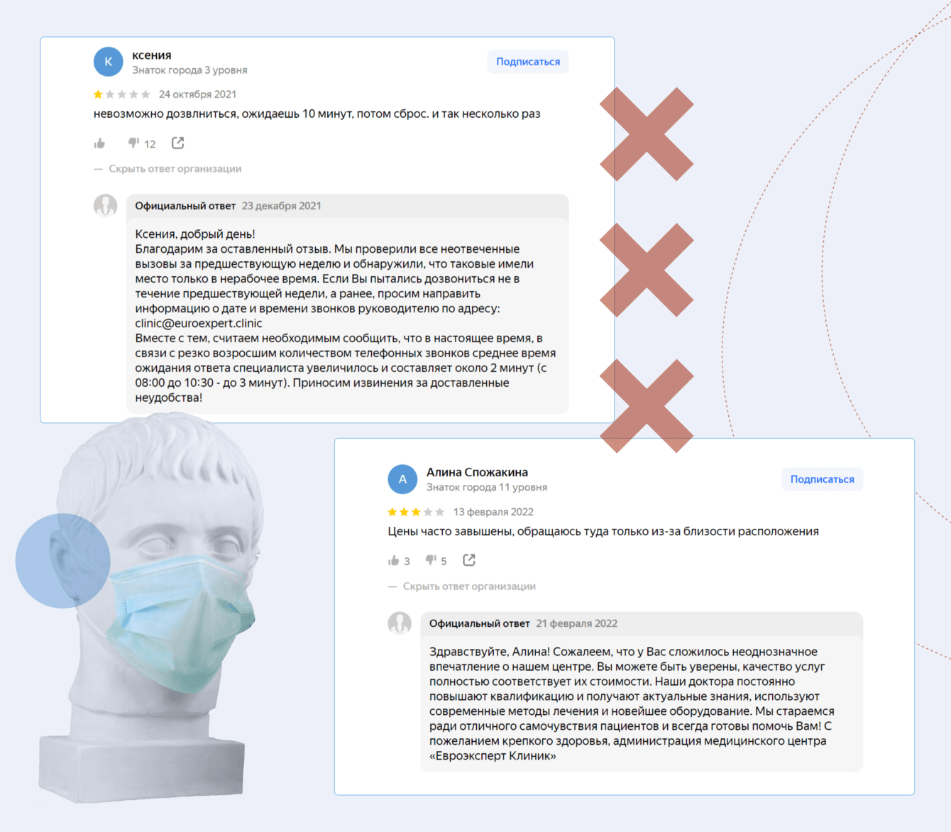 Удалять все плохие отзывы не только нереально, но и бессмысленно. Для медцентров высокого уровня важно грамотно отрабатывать негатив. Представим, что в Яндекс Картах появился отзыв, в котором пользователь критикует услугу в «Евроэксперте».