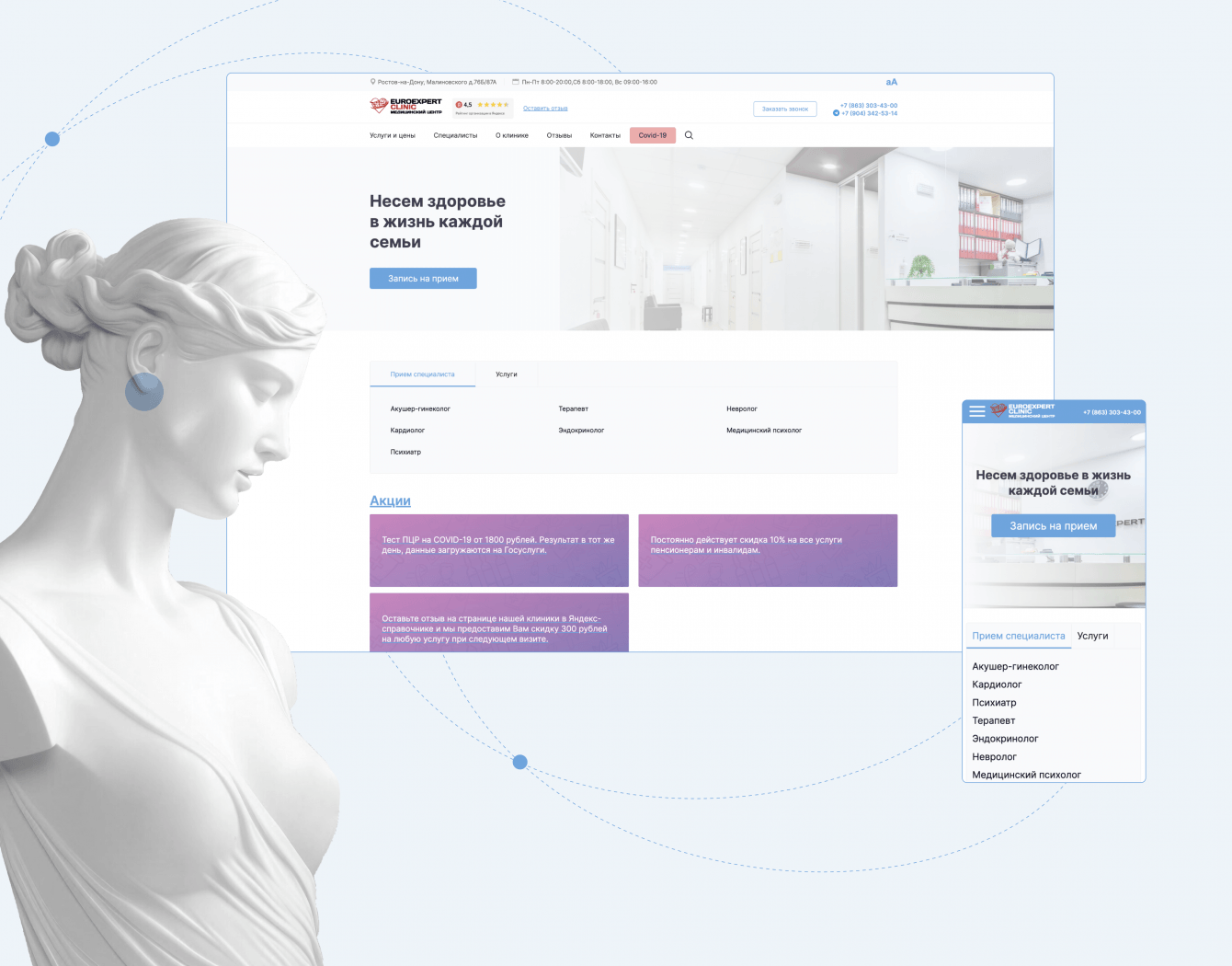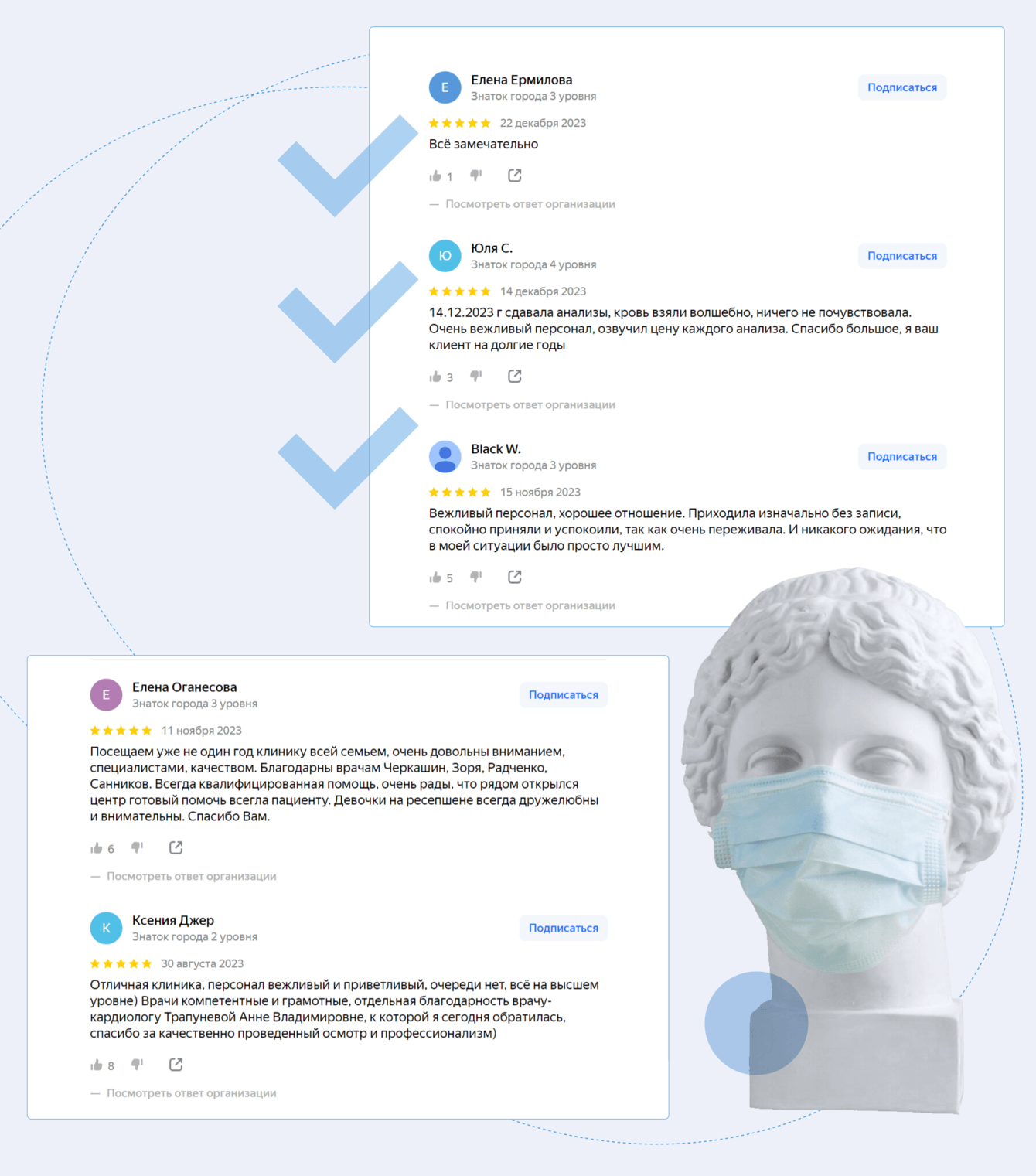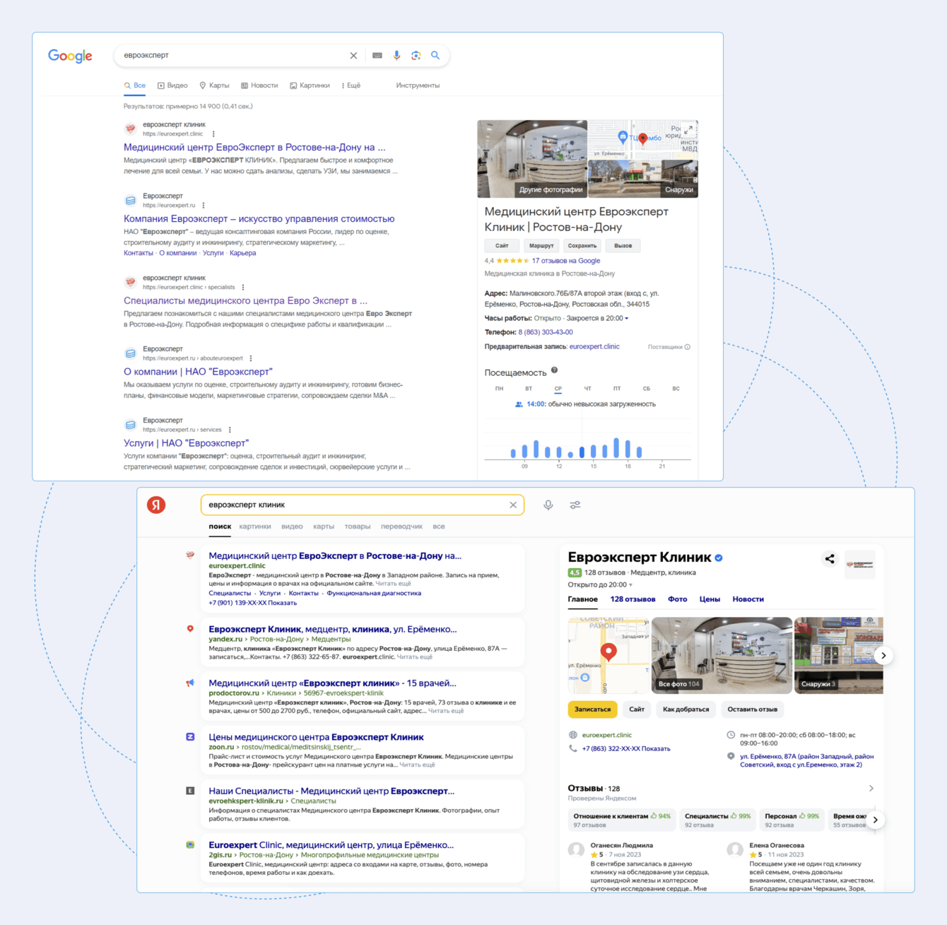 Серьезных проблем с репутацией у медцентра не было. Однако пациенты редко оставляли отзывы в картах или на профильных порталах. В топ-5 поисковой выдачи по брендовым запросам были сайты «тезок» — консалтинговые компании, онлайн-академии и мебельные салоны с названием «Евроэксперт».