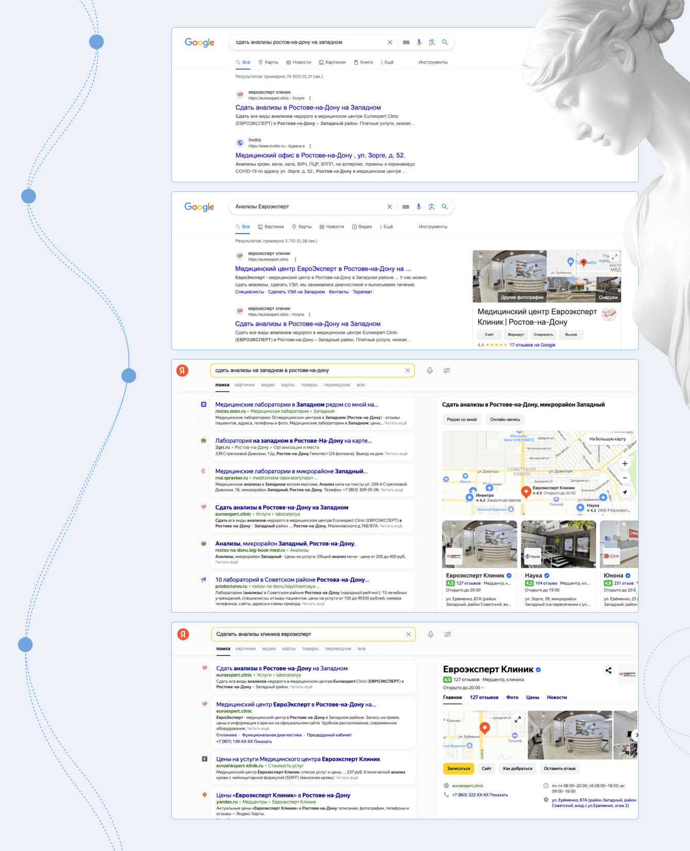 Для того, чтобы SERP помогал привлекать больше пациентов из поиска, мы выполнили несколько задач.