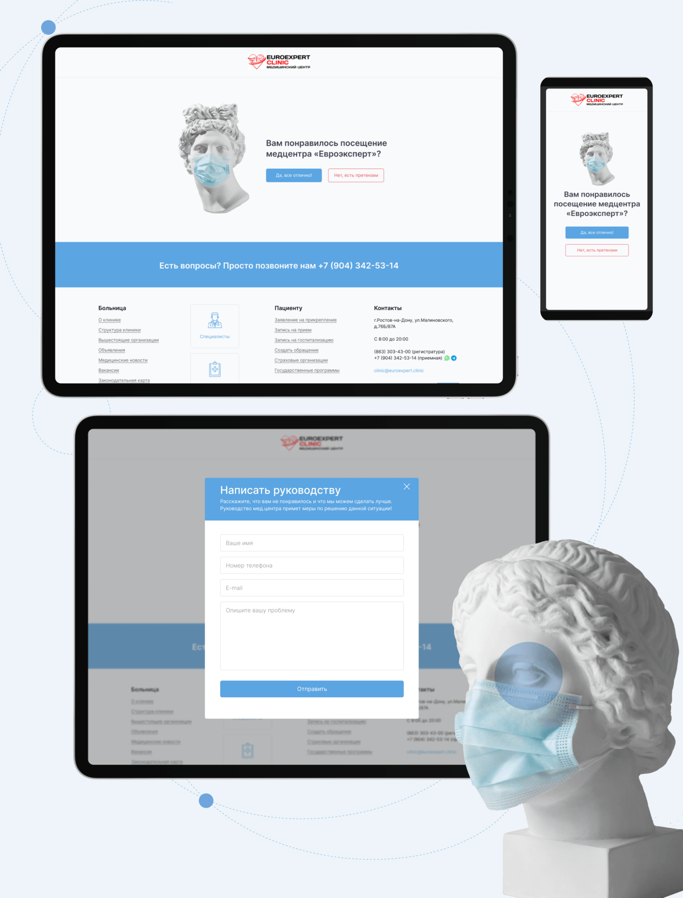 Если же пользователь нажал на кнопку «Нет, есть претензии», он переадресуется на форму обратной связи. Там пациент может передать свои замечания администрации напрямую. Отправленный отзыв сразу попадает в CRM-систему клиники. Затем сотрудники решают проблему с пациентом в индивидуальном порядке.