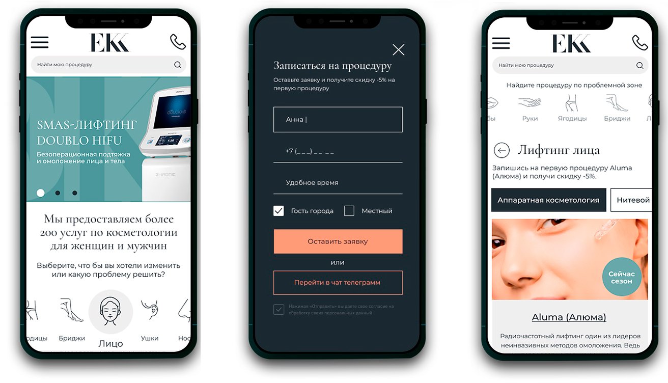 В проекте мы реализовали много удобных для пользователя фишек. Одна из них — это поиск процедур и услуг не только из навигационного меню, но и по проблемным зонам, например, ЛИЦО, ТЕЛО, НОГИ и т.д.