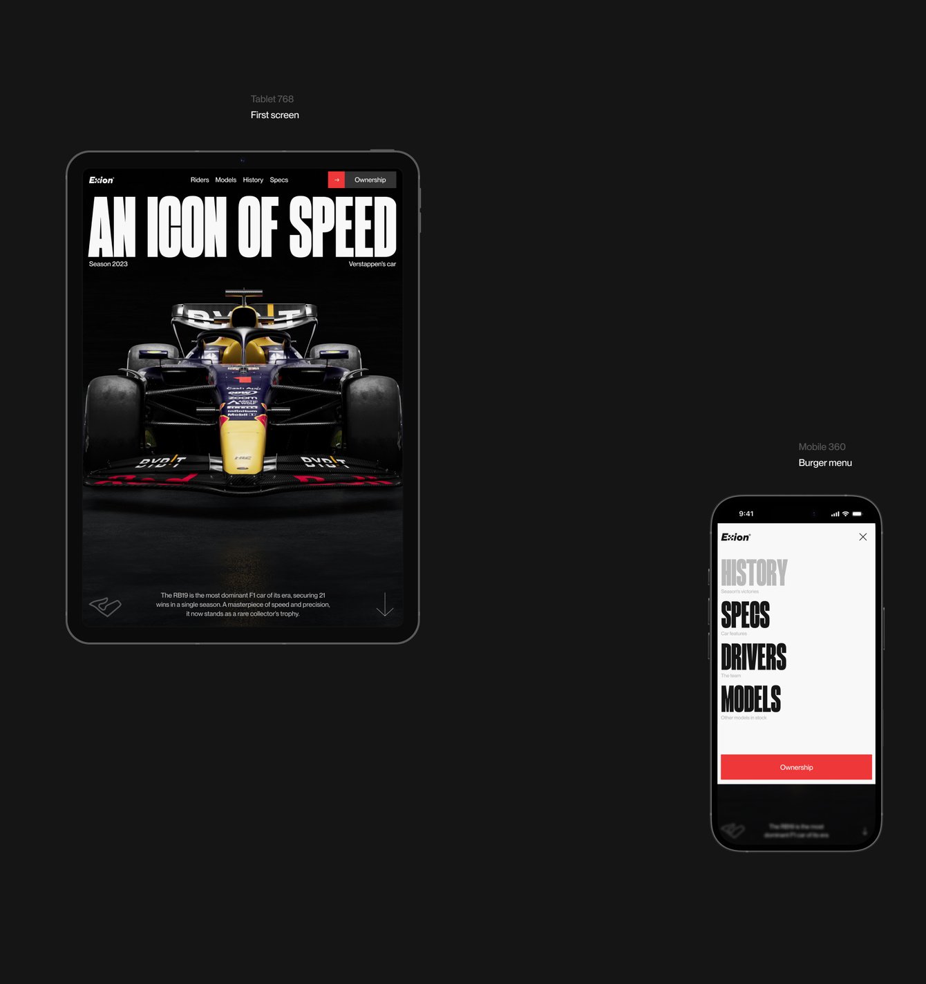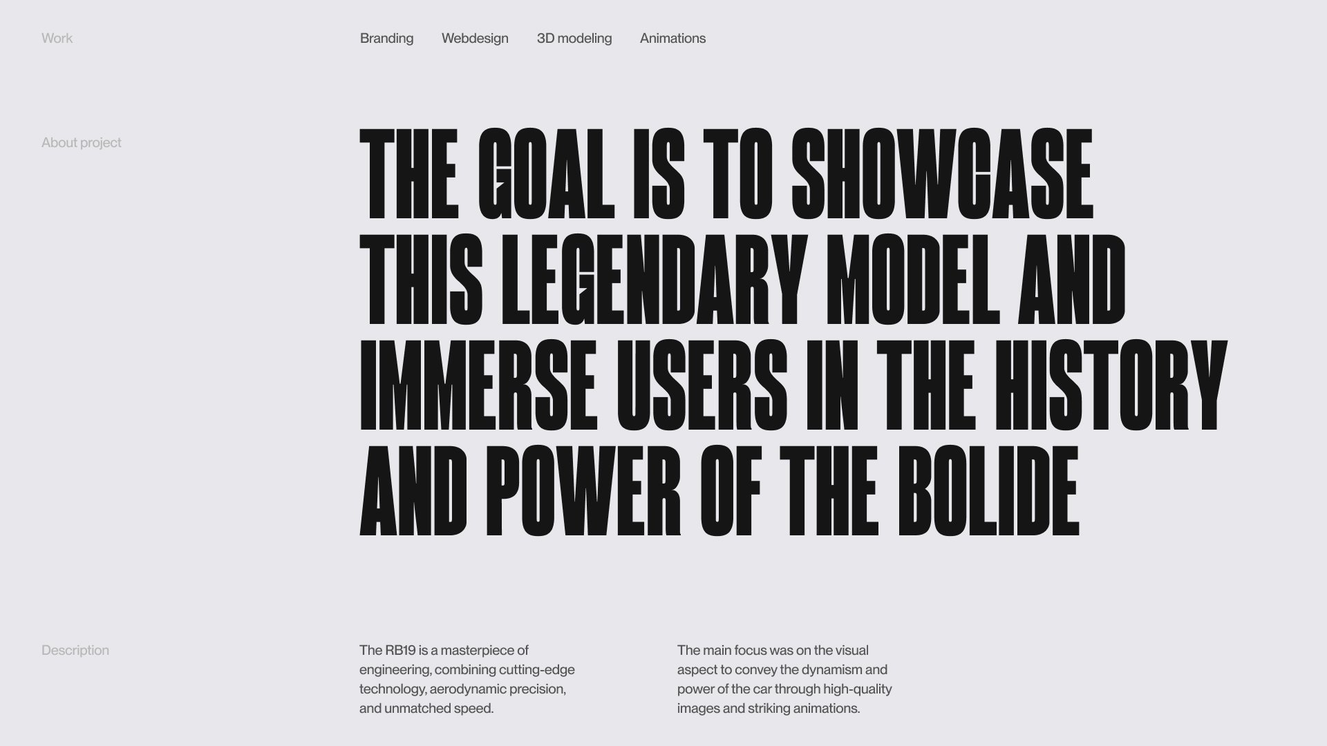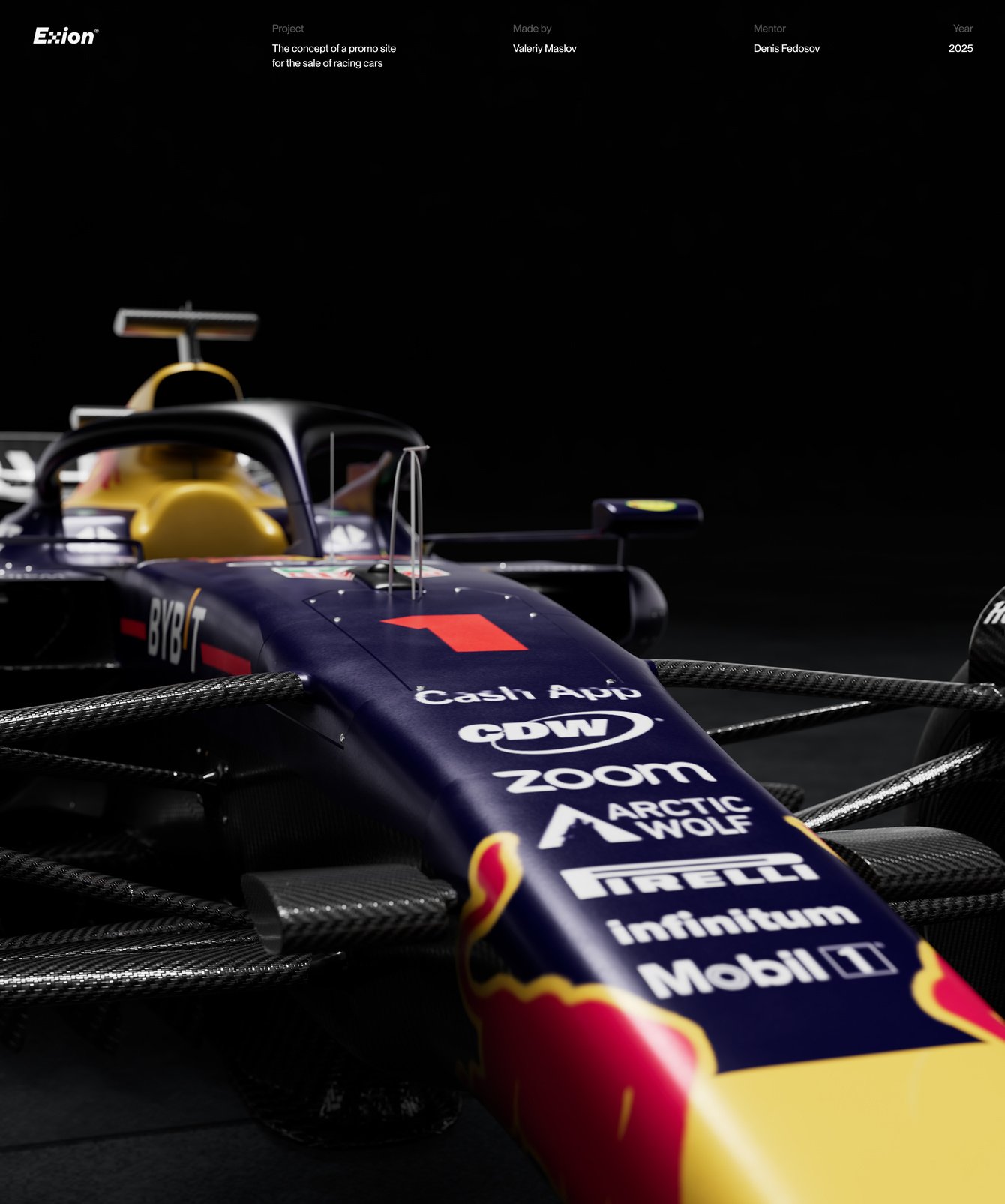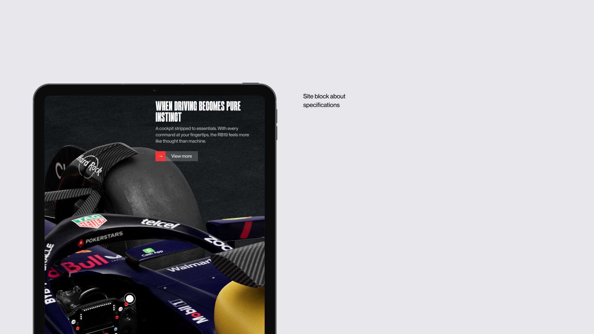 Концепт лендинга, посвященному легендарному болиду формулы 1 RB19. Основная задача в реализации проекта — создать ощущение скорости в каждом блоке, погрузить пользователя в историю и разработать интуитивно понятный интерфейс.
