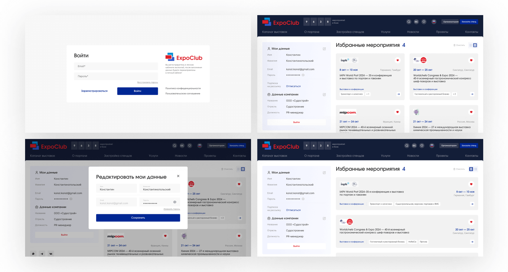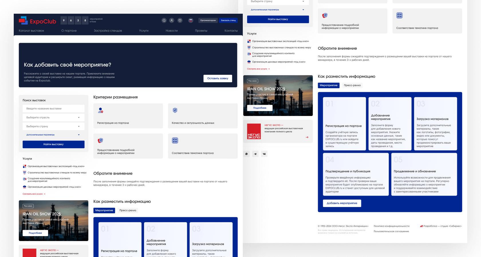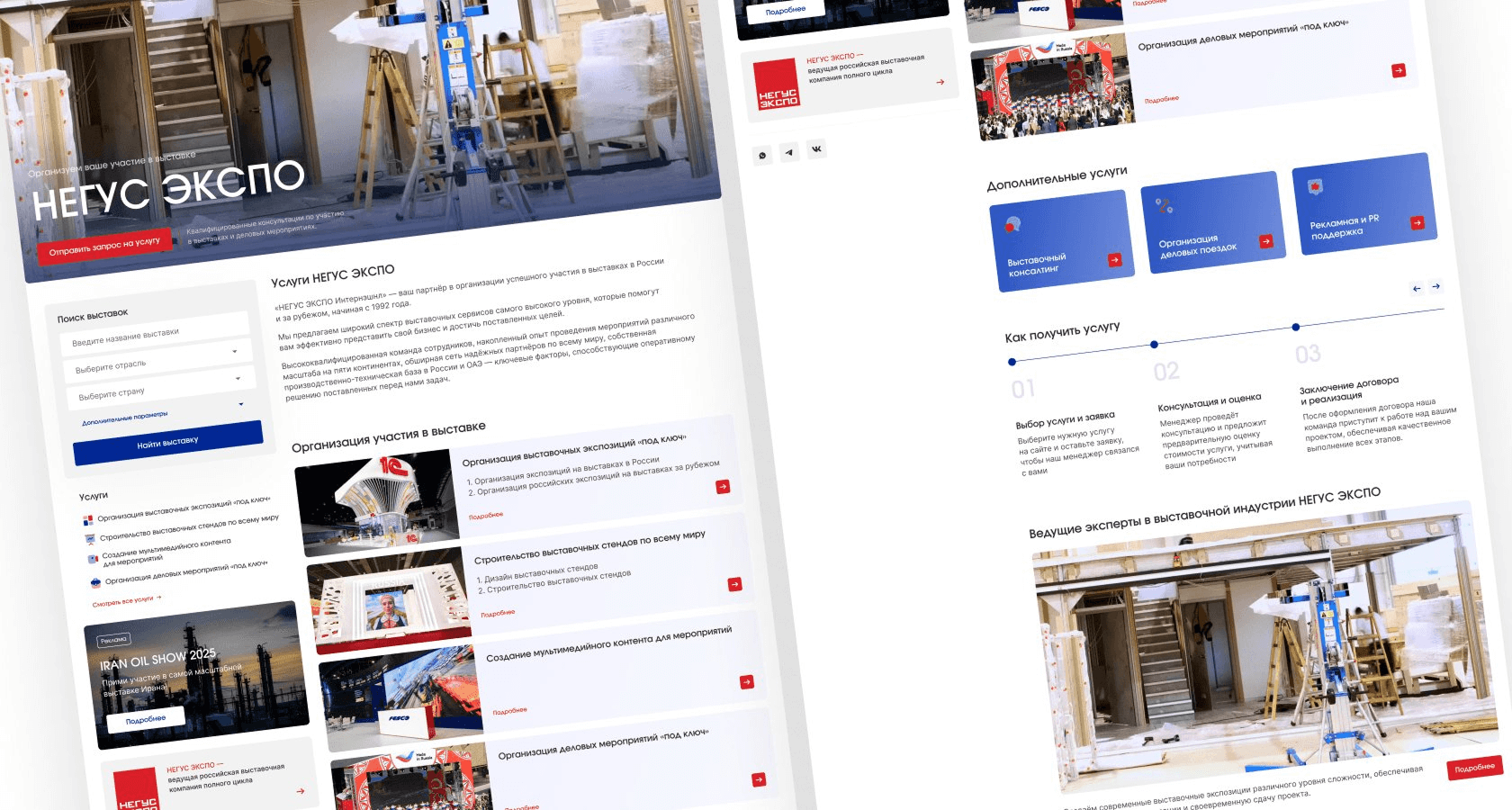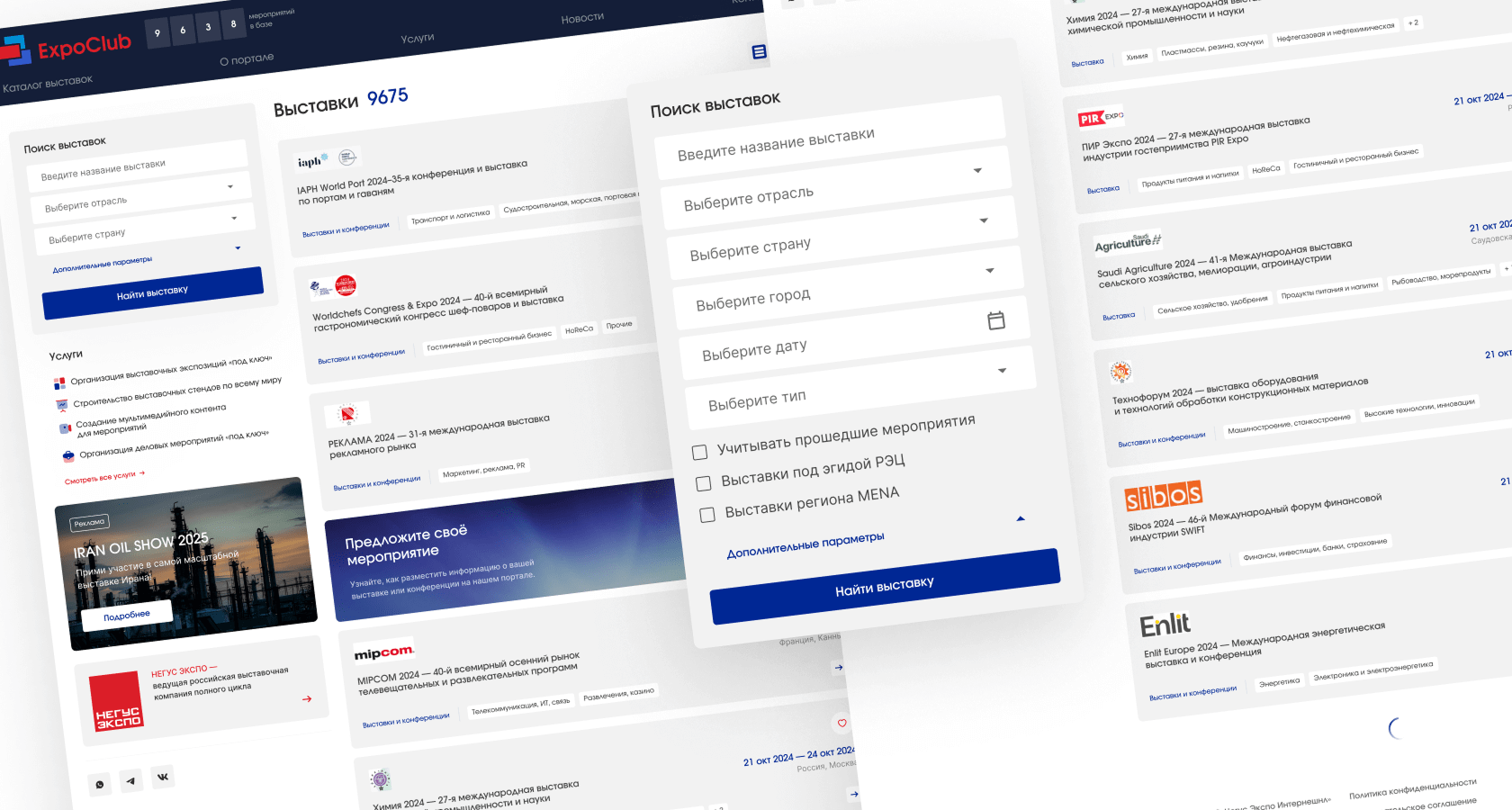 Наша задача была сделать не просто красивый сайт, а продуманный инструмент, который помогает пользователям находить нужные выставки, а заказчику — получать новых клиентов на застройку стендов.