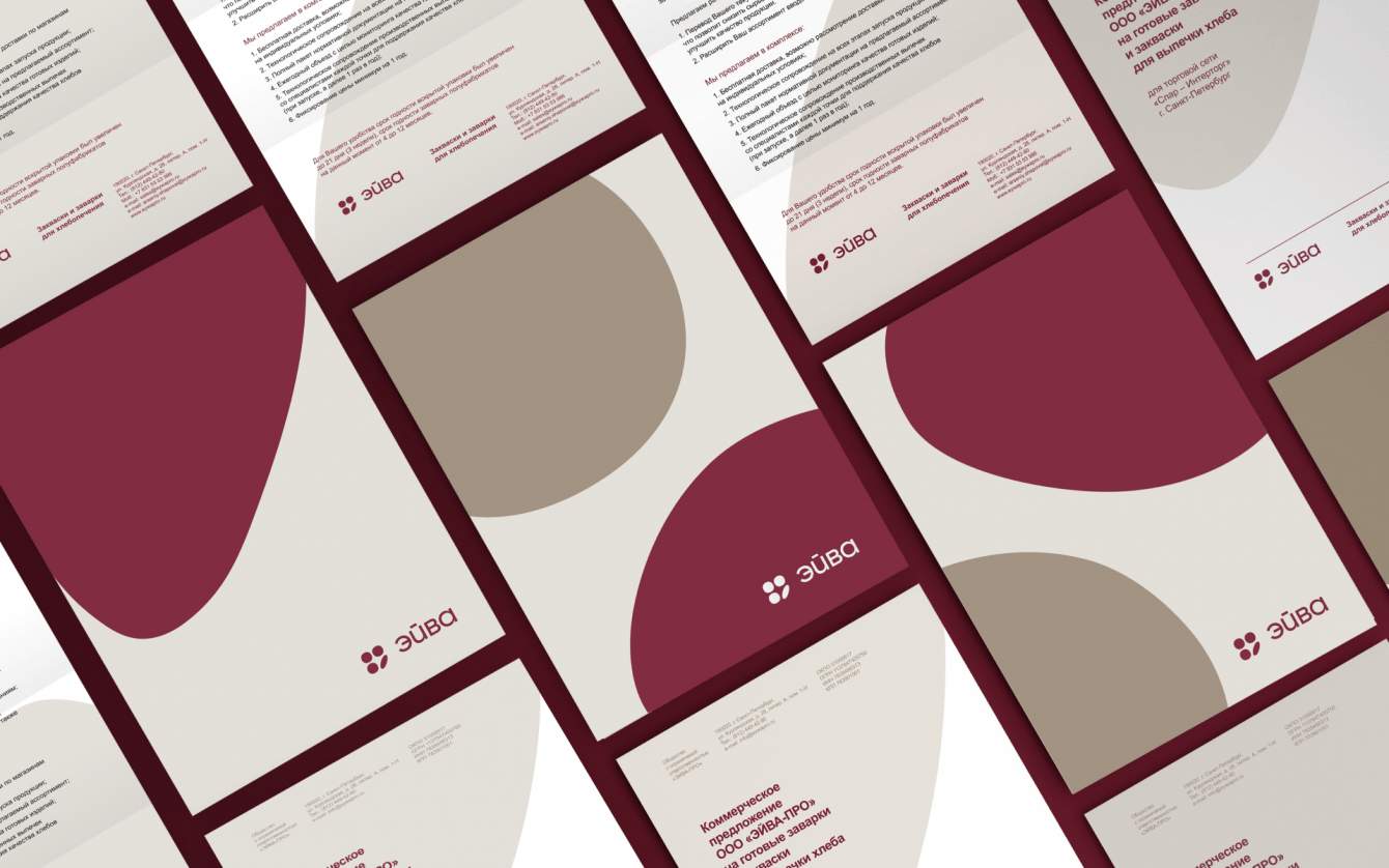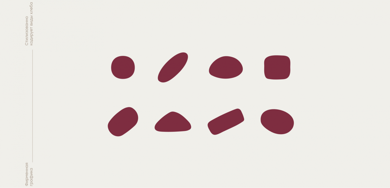 Для оформления презентационных материалов была разработана фирменная графика. Она состоит из простых геометрических фигур, обозначающих разные виды хлеба. Цветовая палитра построена на природных оттенках, которые ассоциируются со средой хлебного производства.