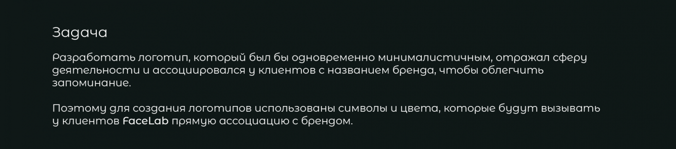 <br />Поэтому для создания логотипов использованы символы и цвета, которые будут вызывать у клиентов FaceLab прямую ассоциацию с брендом.
