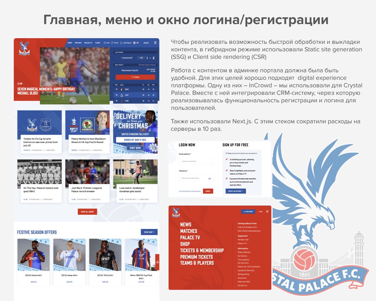 Работа с контентом в админке портала должна была быть удобной. Для этих целей хорошо подходят готовые решения – digital experience платформы. Одну из них – InCrowd – мы использовали для Crystal Palace. Вместе с ней интегрировали CRM-систему, через которую реализовывалась функциональность регистрации и логина для пользователей.