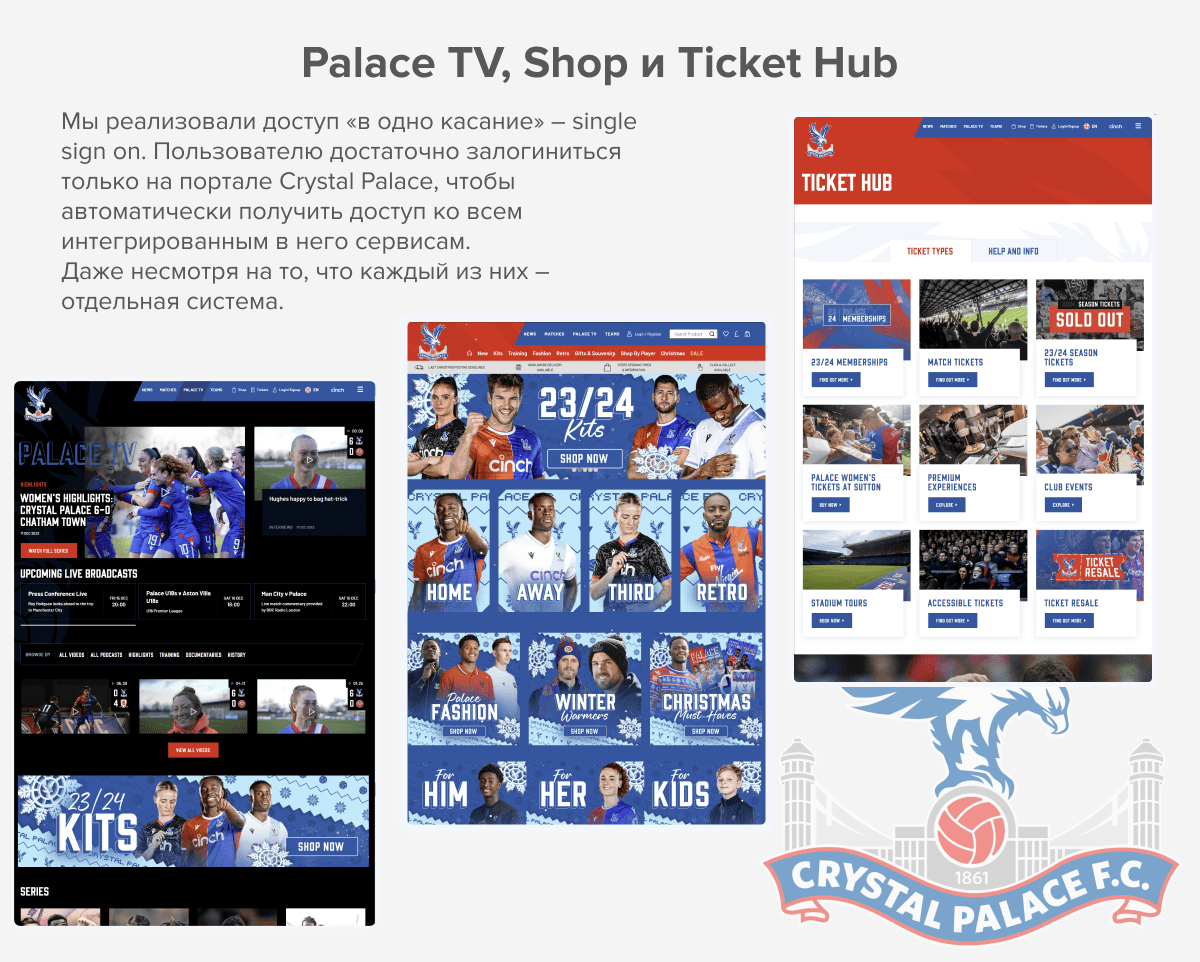 Single sign-on работает и на благо пользователям, и на пользу Crystal Palace. У клуба есть реклама (своя и спонсоров), которая показывается на страницах их платформы. Отображается она не рандомно для каждого пользователя, а исходя из его поведения на ресурсе.