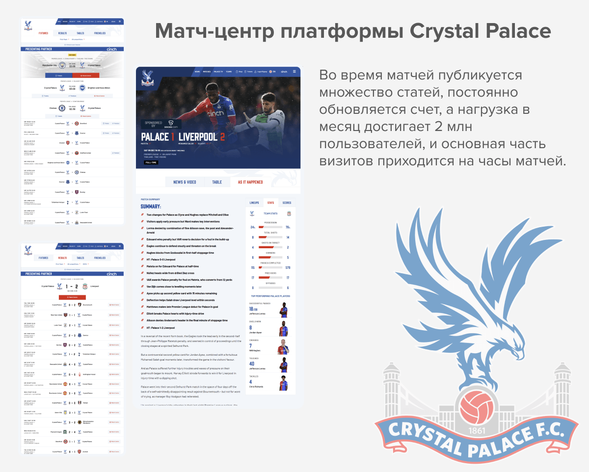 Получилось сделать единый источник всей возможной информации о деятельности клуба, который объединяет и фанбазу Crystal Palace, позволяя получать контент самым быстрым образом. Полноценное создание платформы заняло у нас около 9 месяцев, включая аналитику и фазу активной разработки.