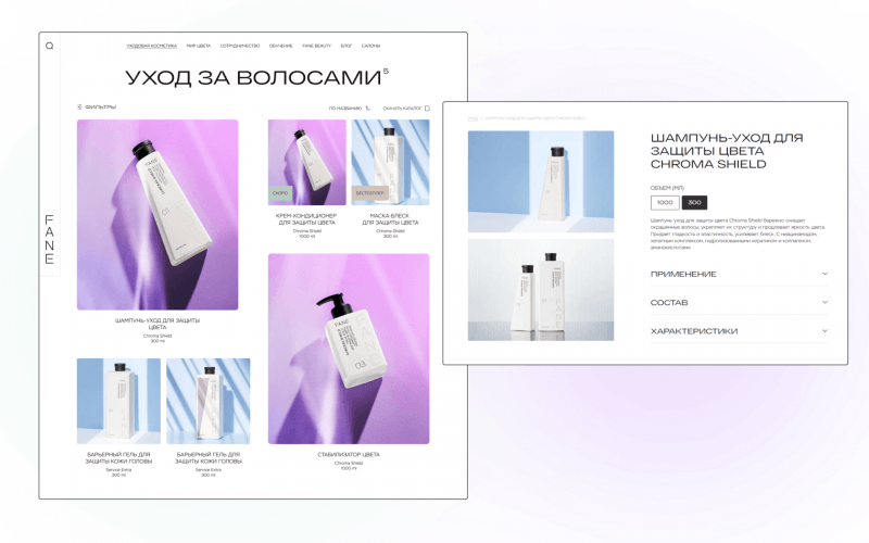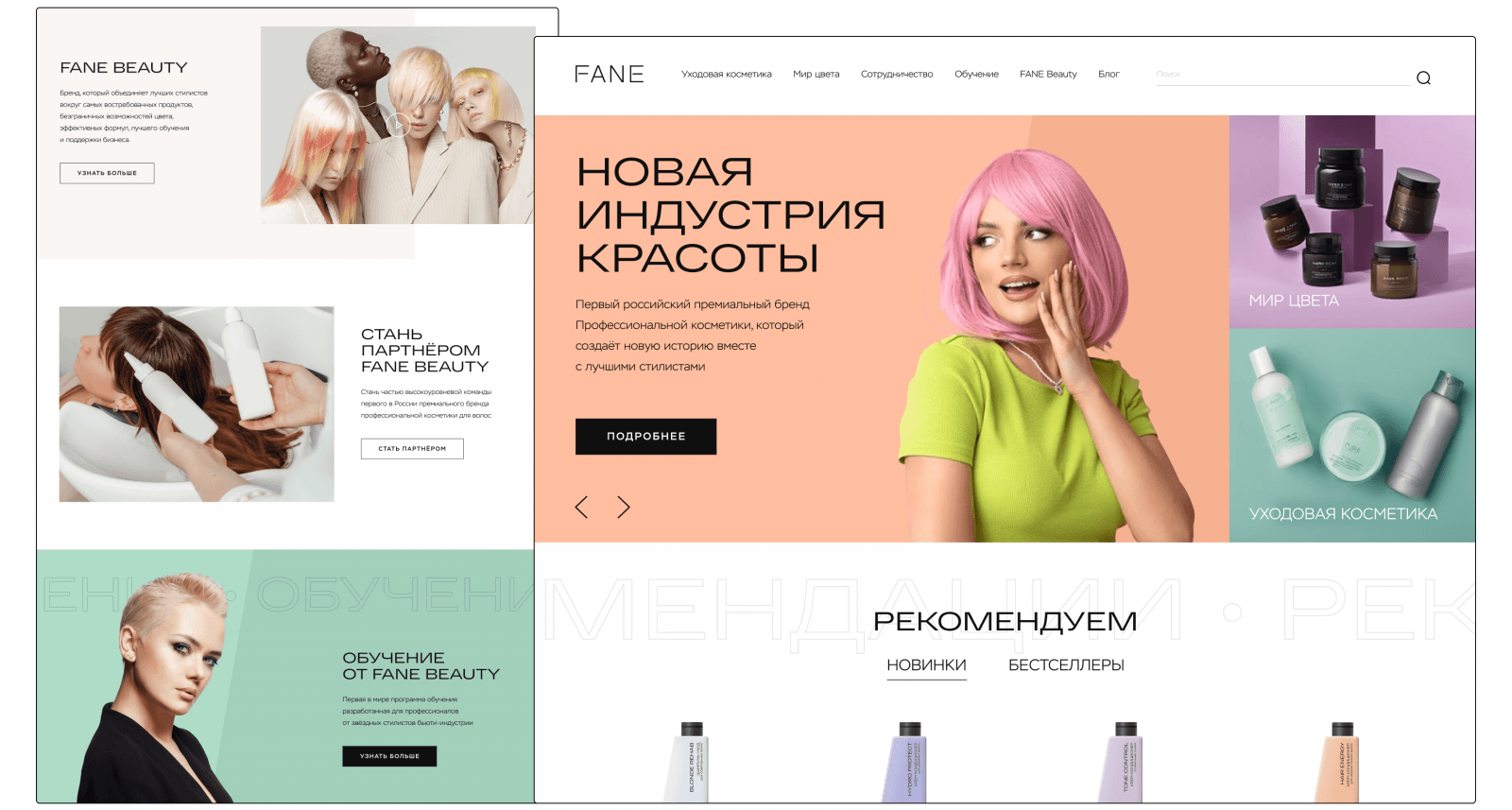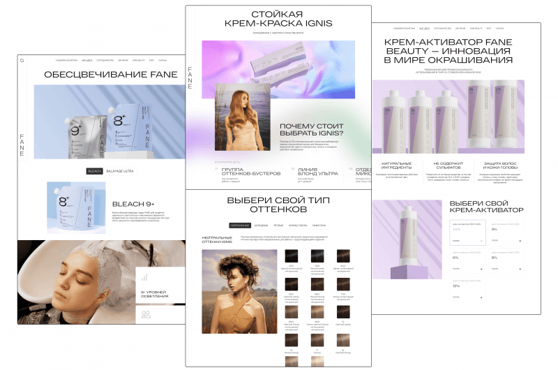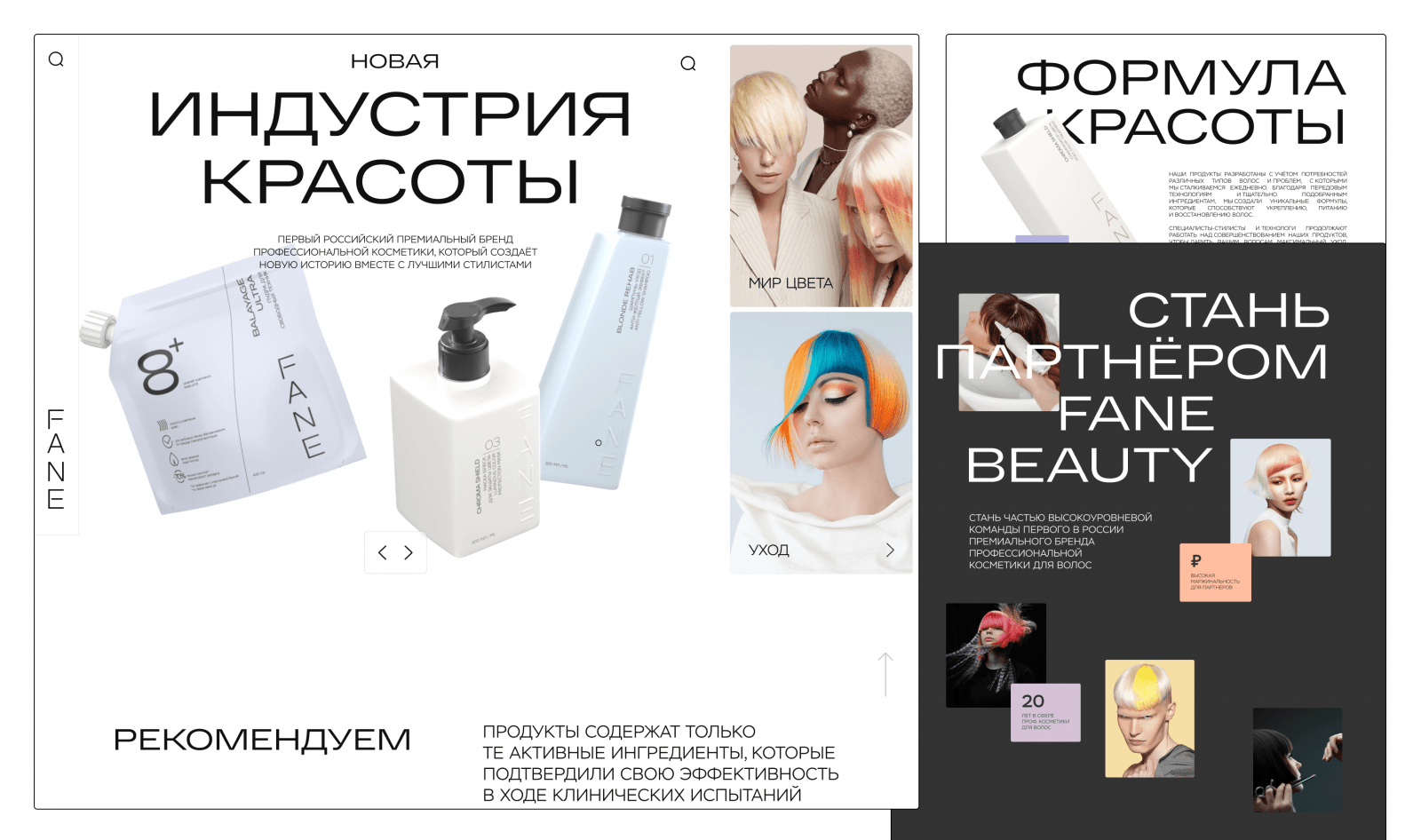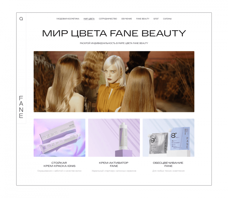 Чтобы раскрыть идею бренда, познакомить с ним потенциальную аудиторию в цифровом пространстве и презентовать продукцию, Fane Beauty требовался сайт. Для скорейшего запуска проекта работу поделили на этапы: сначала — создаем сайт-витрину, позже — делаем полноценный интернет-магазин.
