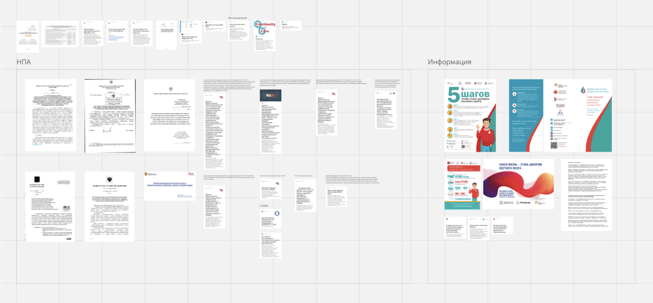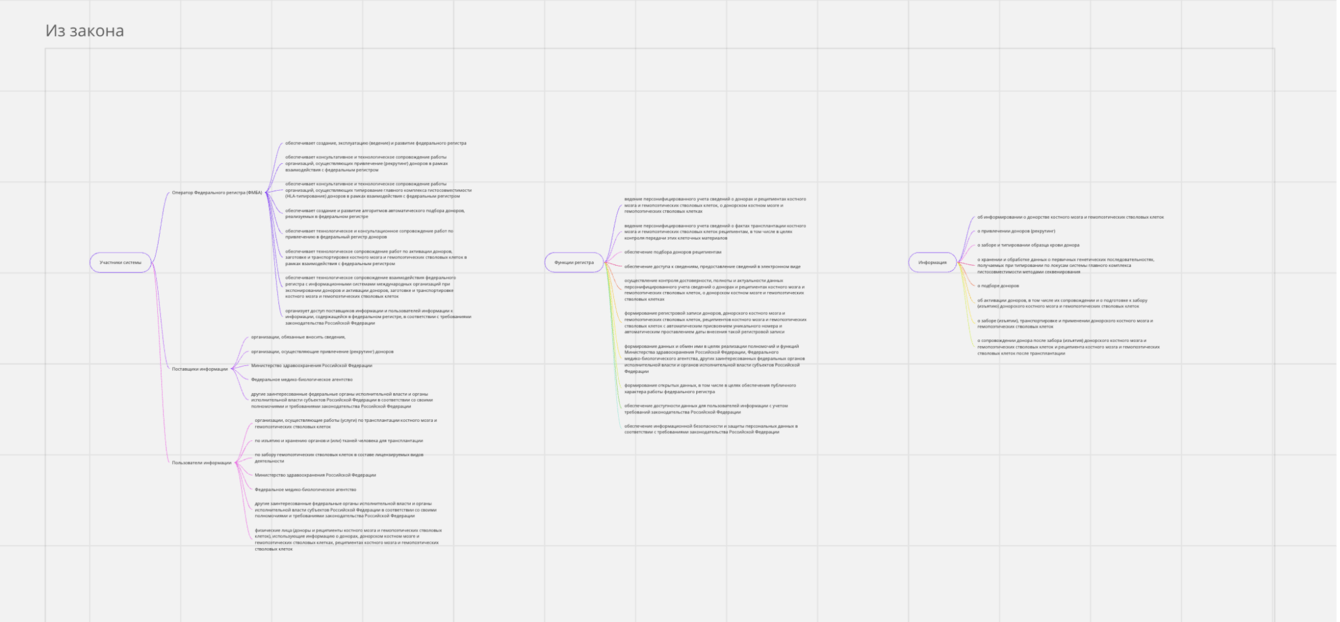Начали с общего изучения темы трансплантации костного мозга, чтобы представлять, как устроены процессы сейчас. Проанализировали нормативно-правовые акты: выписали всю информацию о функциях регистра, о данных, которые нужно обрабатывать и хранить в системе, о правилах ведения регистра и об участниках системы.