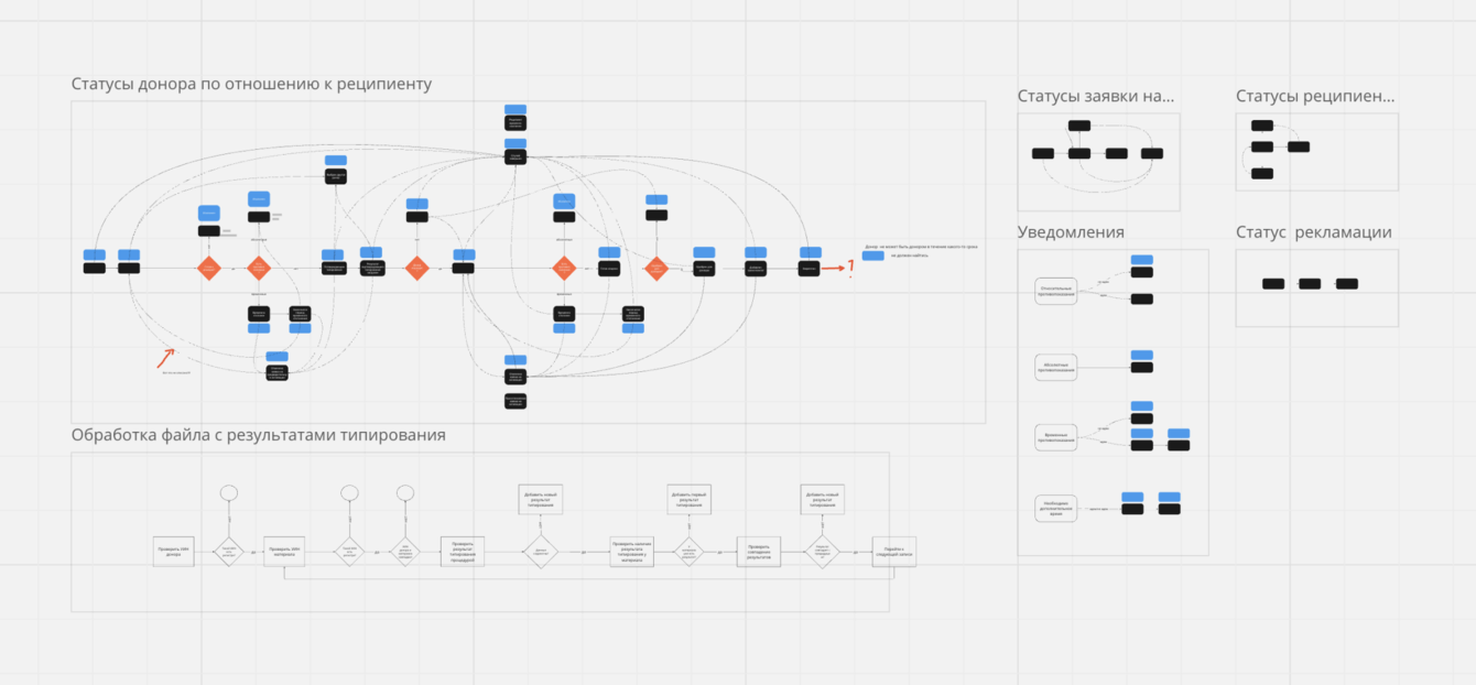 Все полученные данные нужны, чтобы составить полную схему процессов и статусов от подачи заявления на вступления в регистр до трансплантации костного мозга реципиенту, а затем отрисовать прототипы системы.