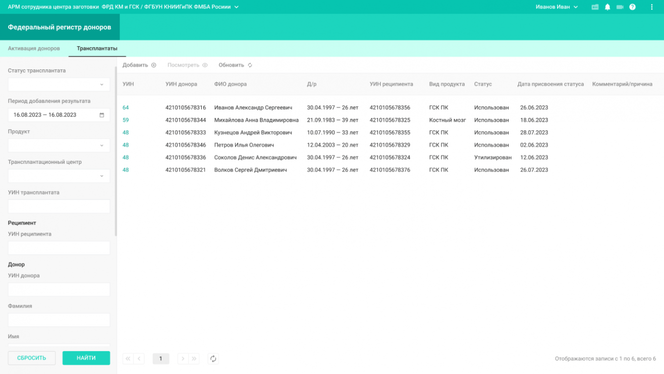 4. Перенесли в систему ранее накопленные данные о донорах и реципиентах