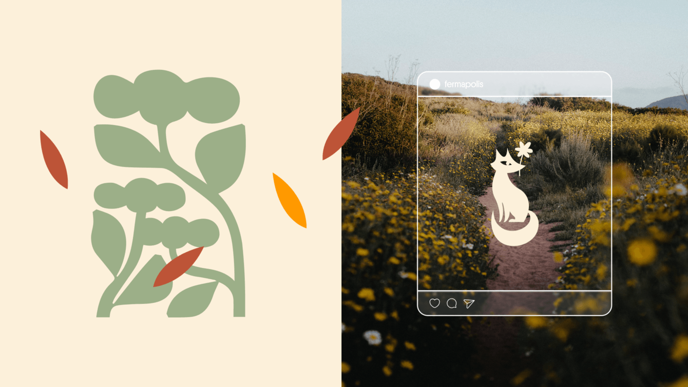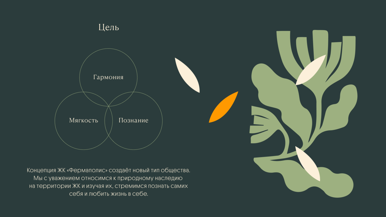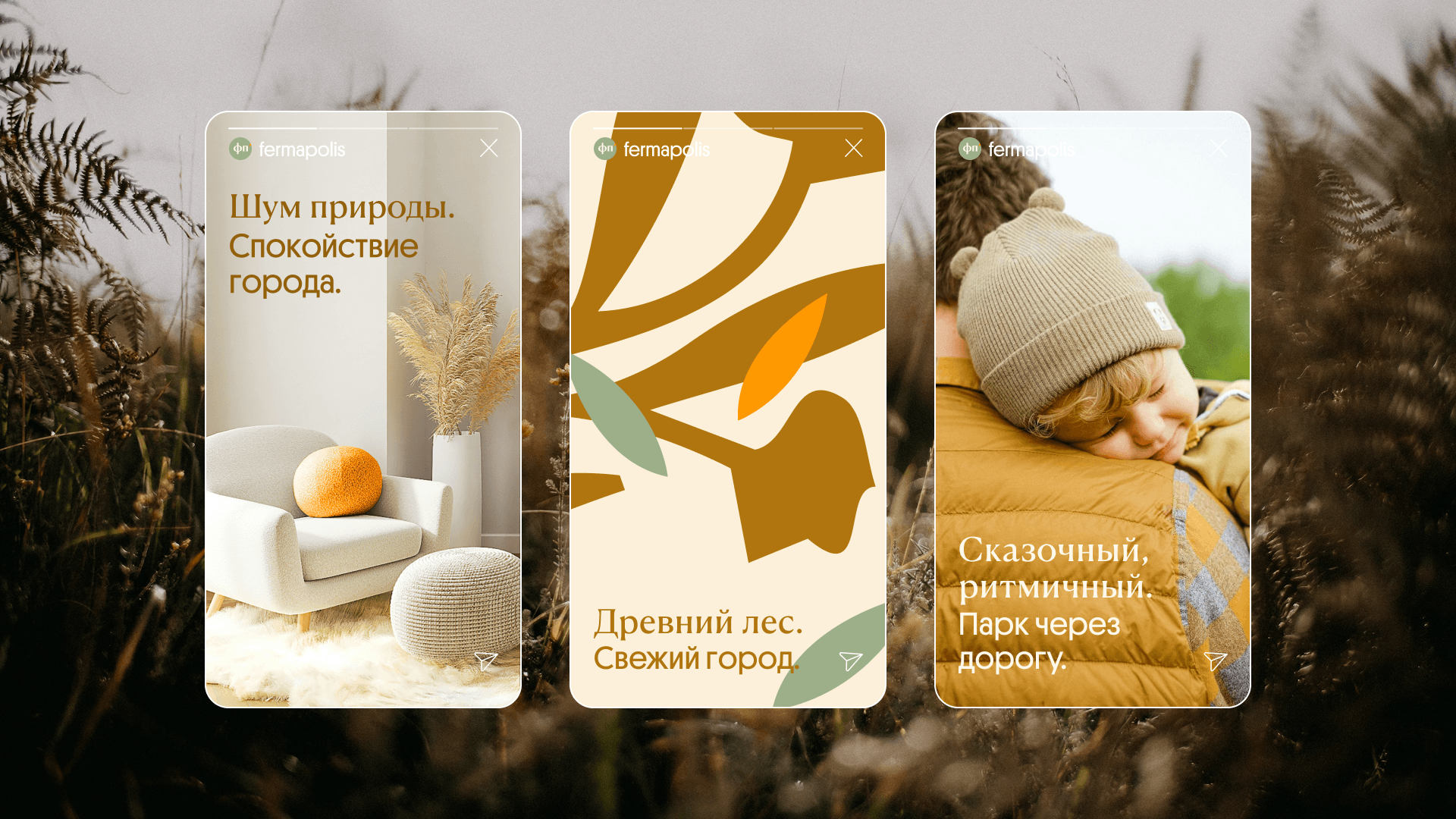 Визуал сочетается со смысловым наполнением — «Фермаполис — дом, где растет любовь к живому». В концепции много цветов: природная палитра, которая сочетает в себе оттенки зеленого, рыжего, коричневого. За визуальную основу мы взяли умеренную натуральность и экологичность, взаимодействующие на грани между природным и современным. Естественные цвета и формы, воплощающие спокойствие и городской комфорт, сочетаются с натуральностью и органичностью природы.