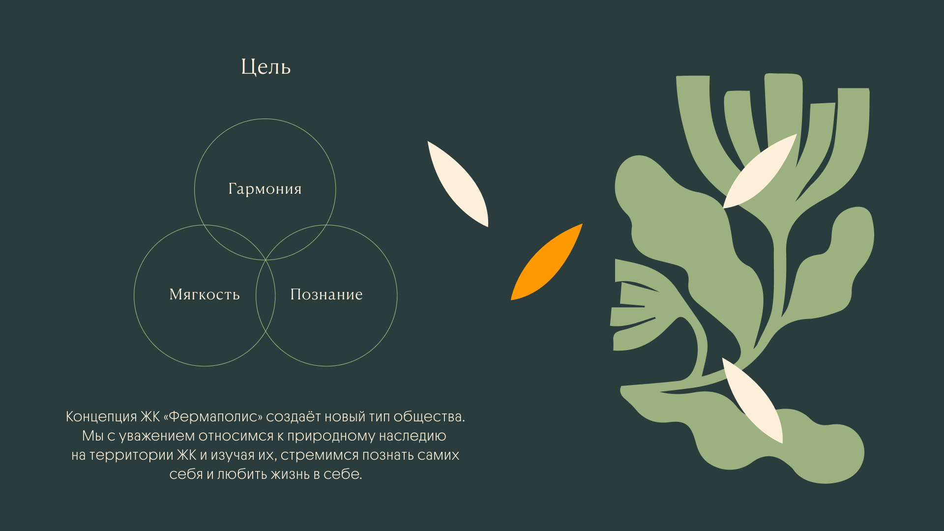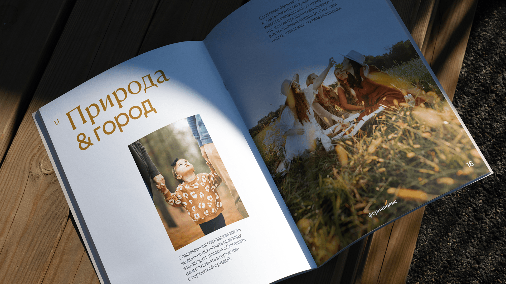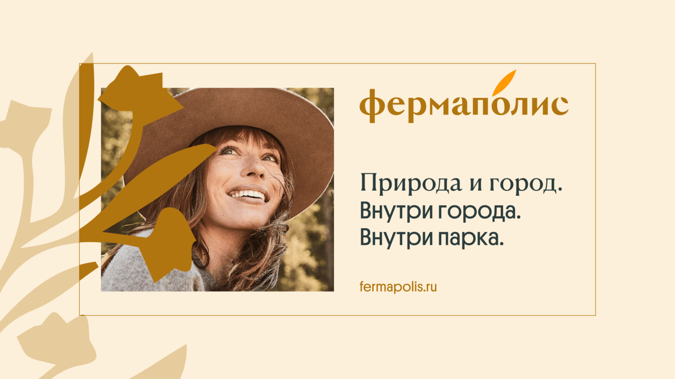 Все это органично скомбинировано в бренде, который мы создали для ЖК Фермаполис. Он объединяет функциональную натуральность, в которой городская среда становится частью живого пространства.