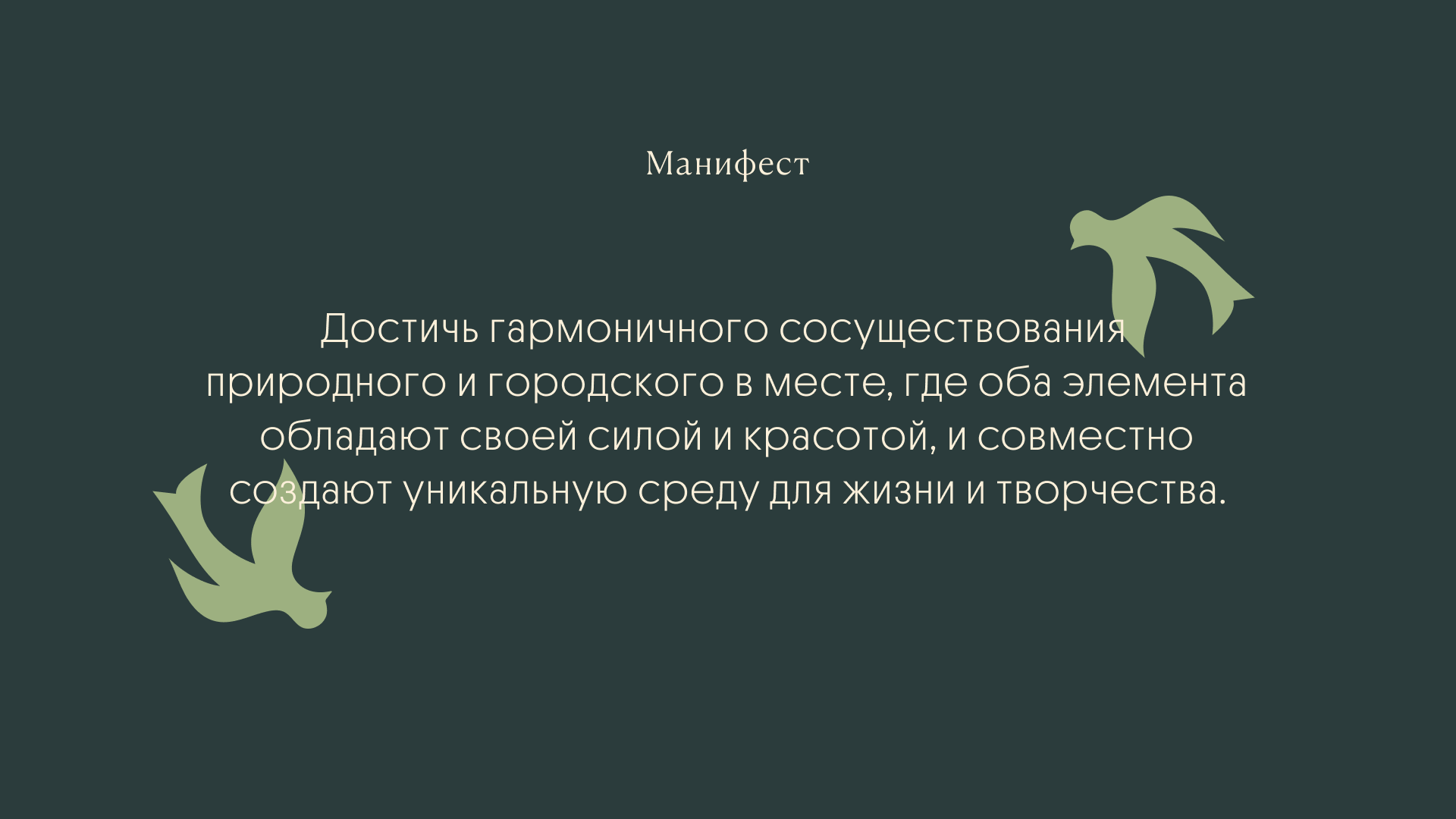 В позиционировании мы делаем акцент на гармоничном сочетании полярных понятий: драйв и чилл, зелень и камень, гармония и стремление. Задачей проекта является создание идеального симбиоза городского и природного комфорта.