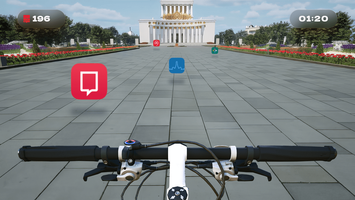 Игровая задача усиливает вовлечённость: управляя велосипедом, необходимо за ограниченное время собрать как можно больше иконок городских мобильных приложений. Таким образом, пользователь исследует цифровую копию городской среды и знакомится с экосистемой сервисов Москвы.